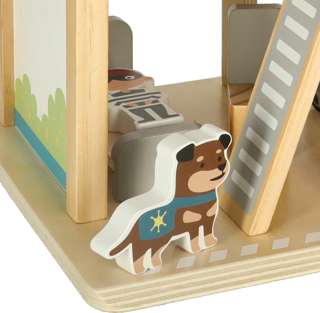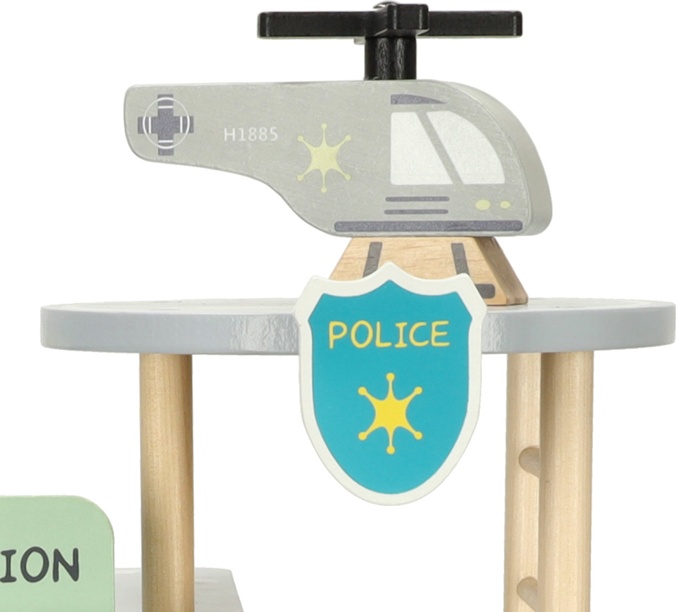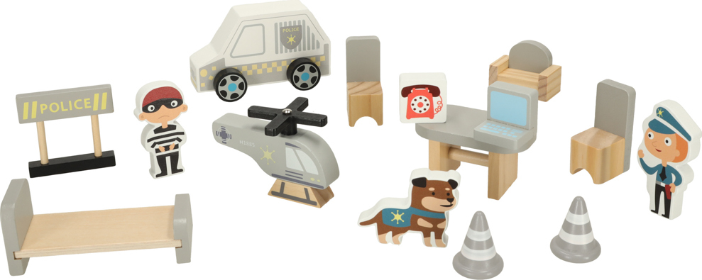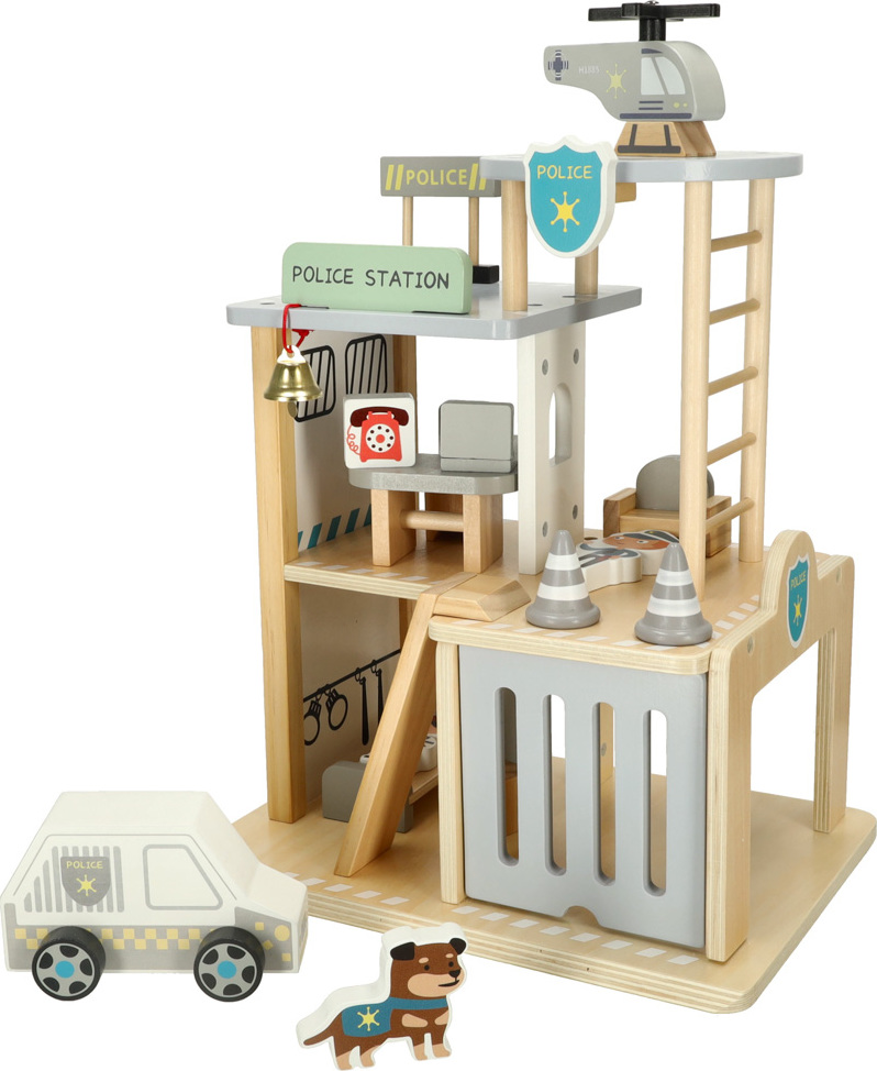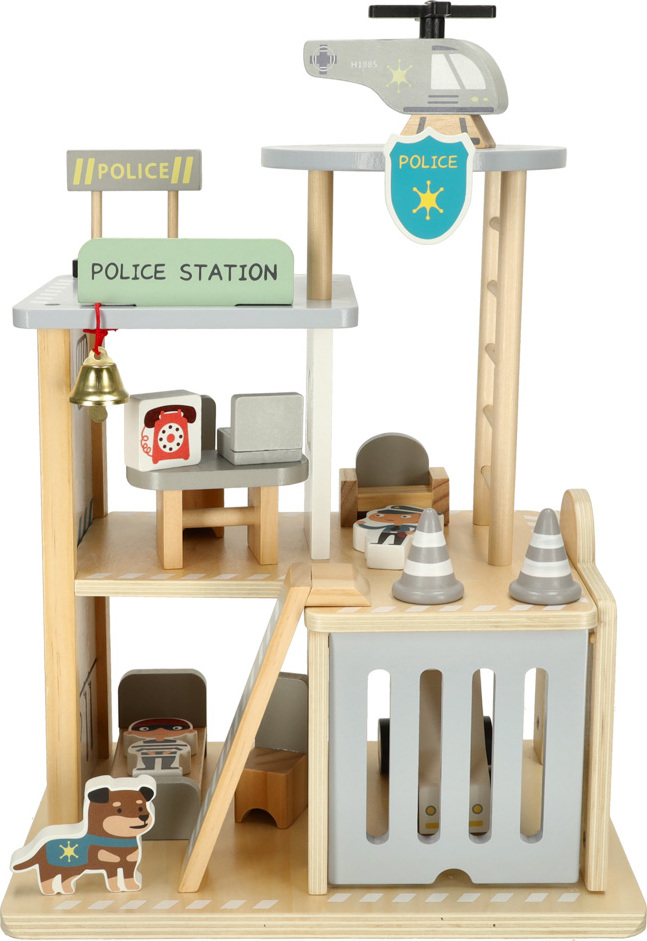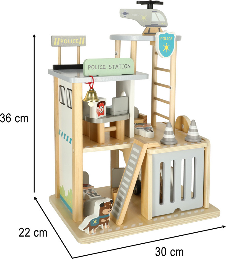 Tato dřevěná policejní stanice je perfektní hračkou pro nejmenší, kteří milují pořádek a bezpečí! Sada obsahuje vše, co potřebujete k vytvoření nejrůznějších herních scénářů – policistu, zloděje a vycvičeného psa, a také řadu kusů nábytku a vozidel: policejní auto a vrtulník. Stanice má tři úrovně a zahrnuje garáž, kancelář a přistávací plochu pro vrtulníky. Všechny díly jsou vyrobeny z hladce broušeného dřeva a natřeny netoxickými barvami.