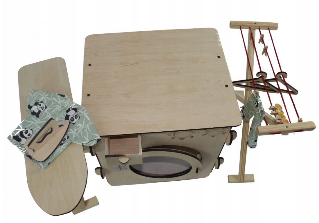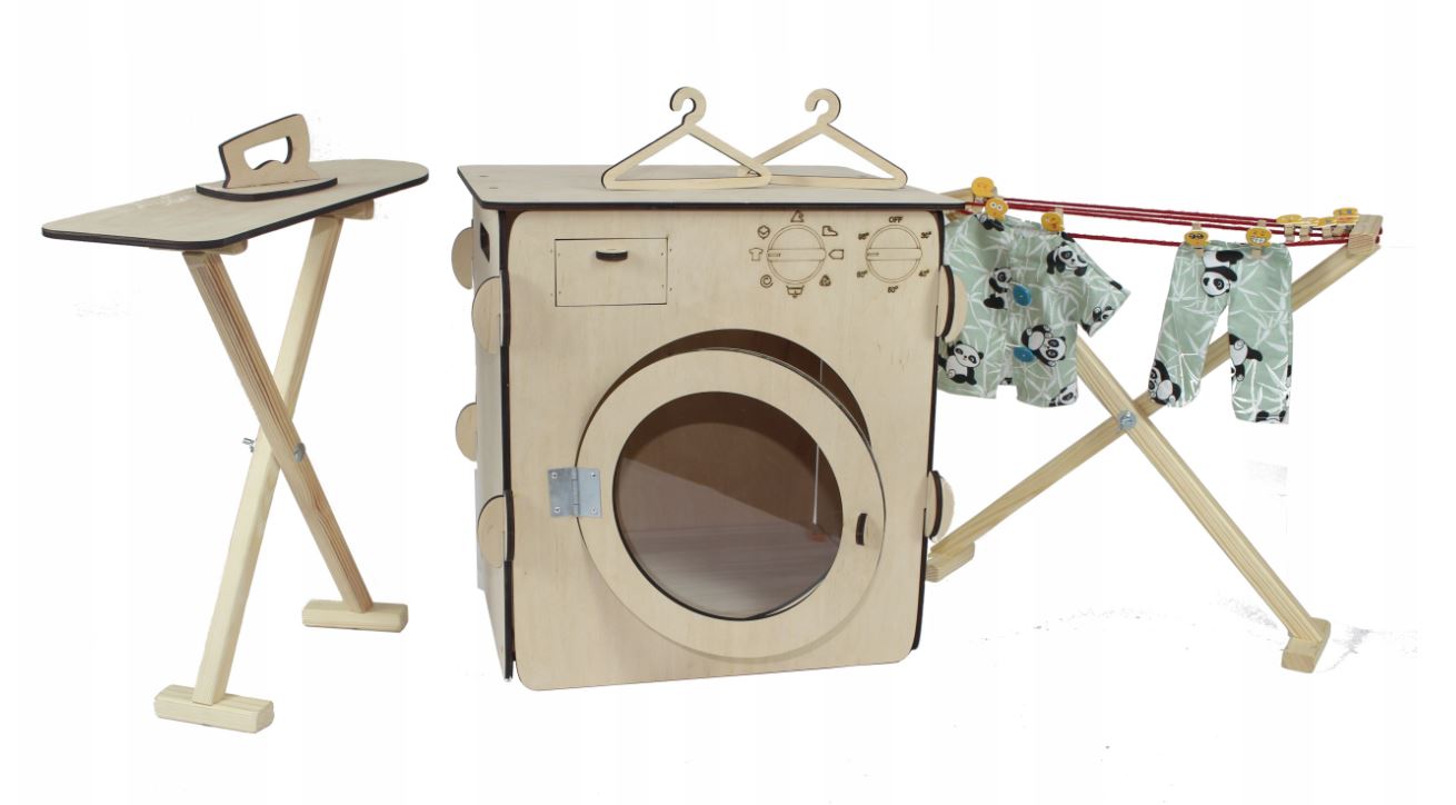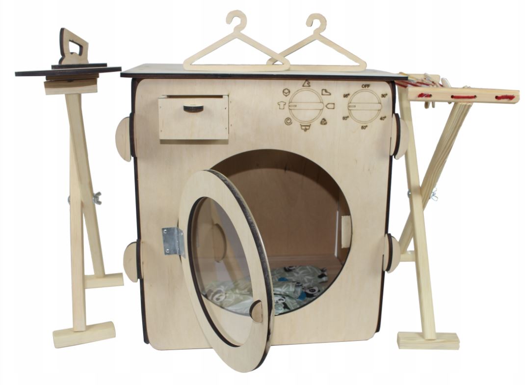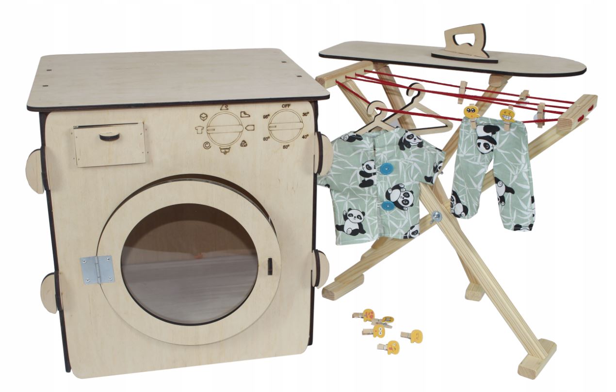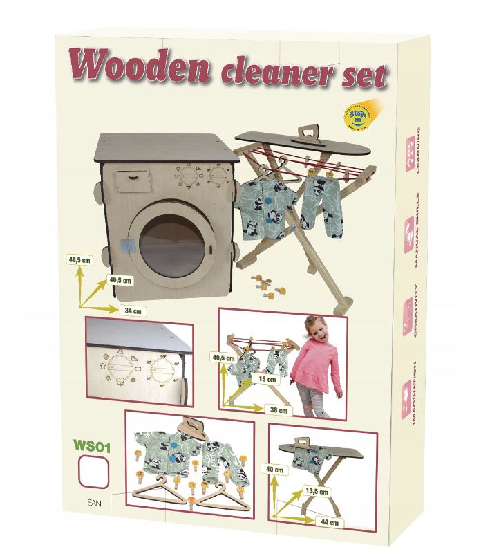 Jedinečná dřevěná pračka s bohatým příslušenstvím poskytne skvělou zábavu každému dítěti, které doma rádo pomáhá s úklidem. Pračka je vyrobená ze dřeva a obsahuje doplňky potřebné ke hře. Součástí sady je pračka s otevíracími dvířky a zásobníkem na prací prostředek, žehlička, žehlicí prkno, sušák na prádlo, věšáky, 10 kolíků se smajlíky, oblečení ve formě košilky a kalhot, imitace knoflíků a funkcí na pračce. Vše je baleno v krásném dárkovém balení.