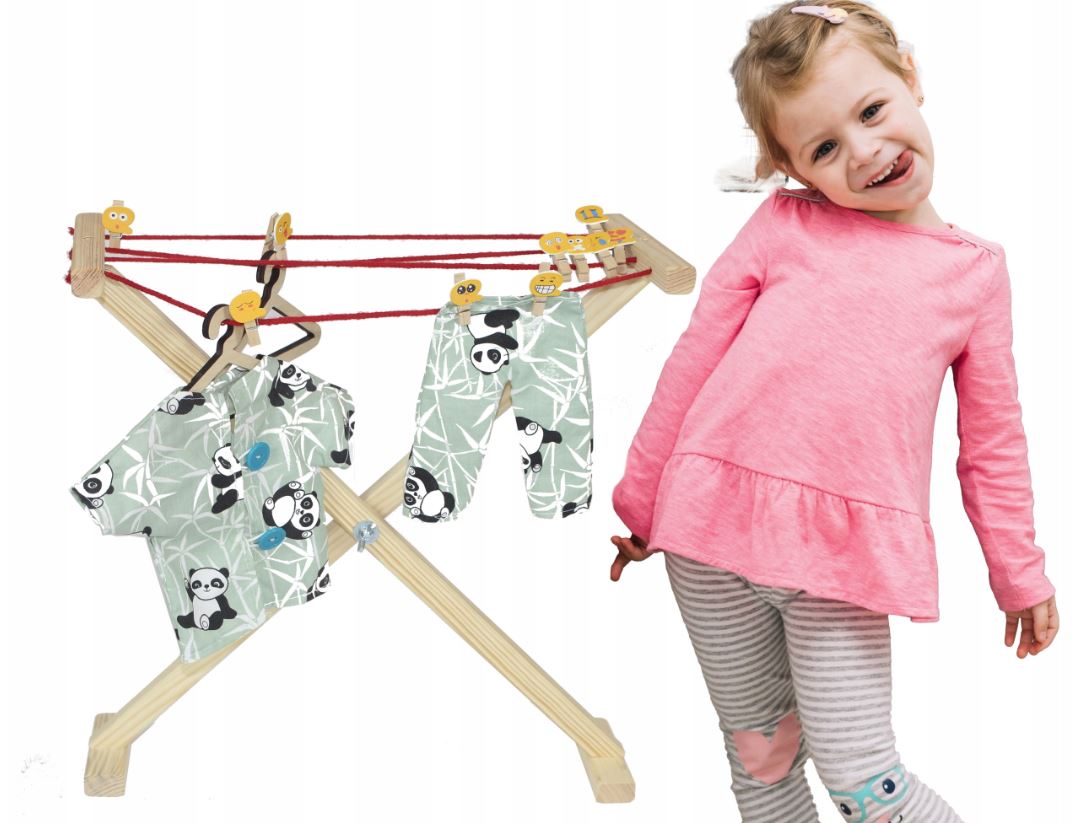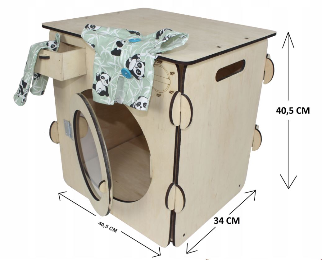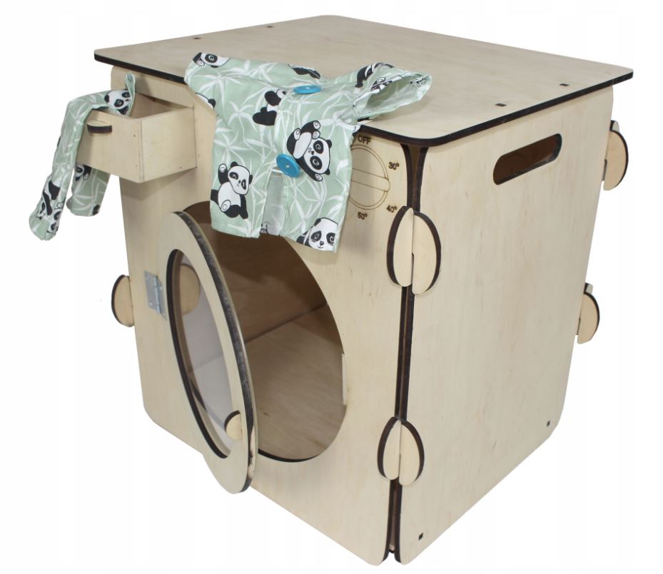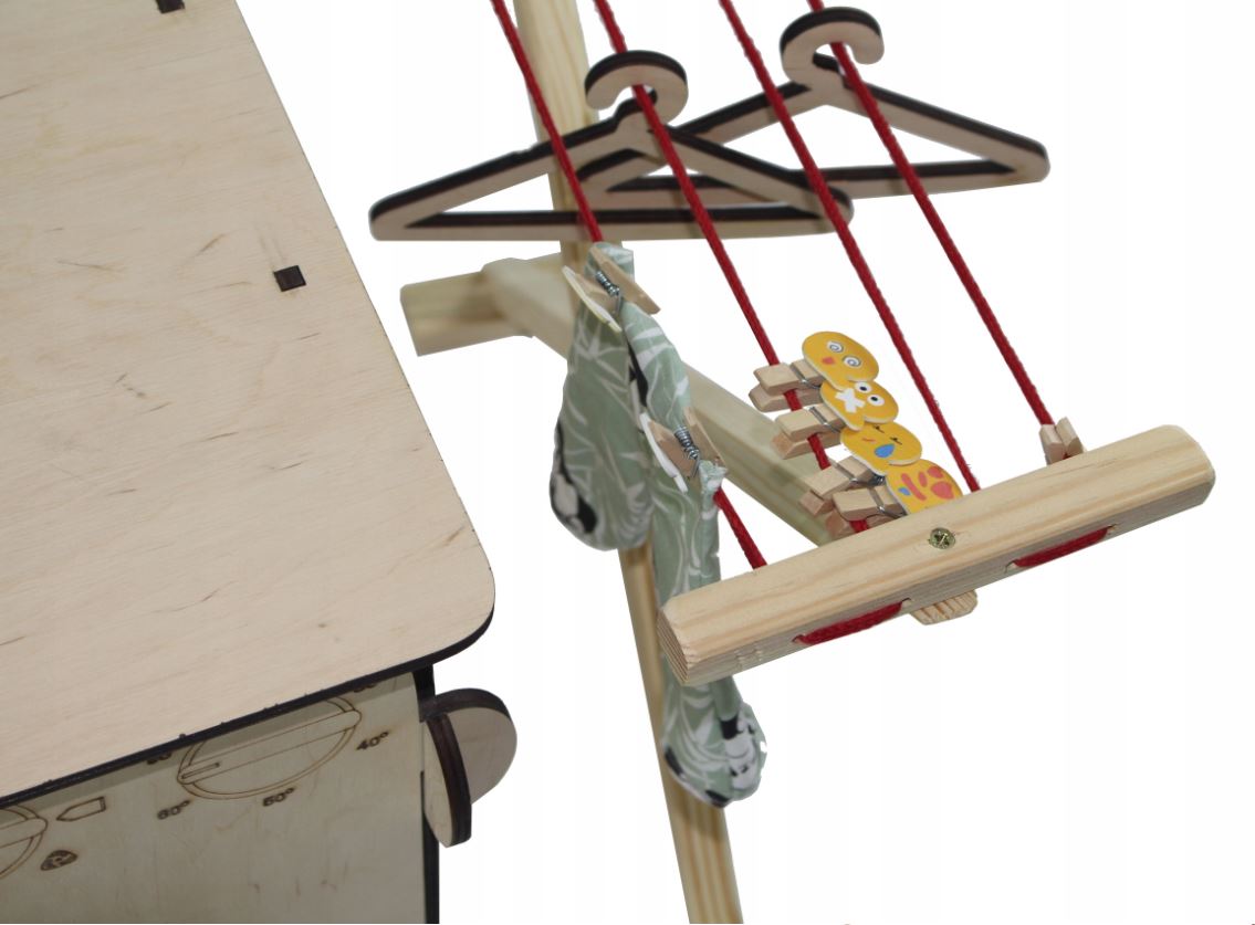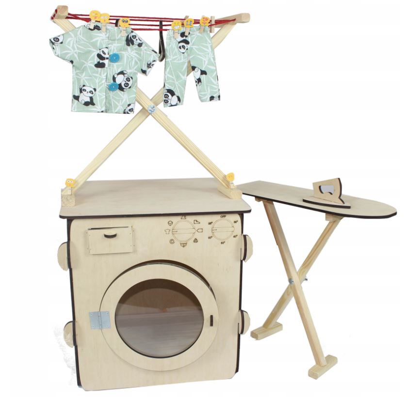Jedinečná dřevěná pračka s bohatým příslušenstvím poskytne skvělou zábavu každému dítěti, které doma rádo pomáhá s úklidem. Pračka je vyrobená ze dřeva a obsahuje doplňky potřebné ke hře. Součástí sady je pračka s otevíracími dvířky a zásobníkem na prací prostředek, žehlička, žehlicí prkno, sušák na prádlo, věšáky, 10 kolíků se smajlíky, oblečení ve formě košilky a kalhot, imitace knoflíků a funkcí na pračce. Vše je baleno v krásném dárkovém balení.