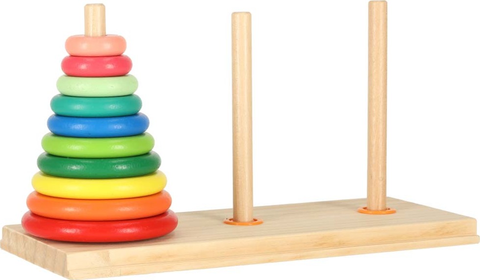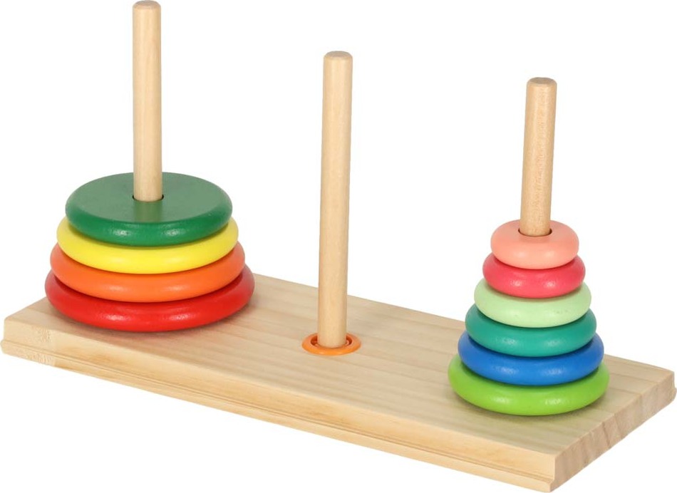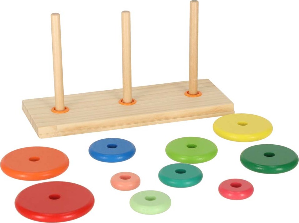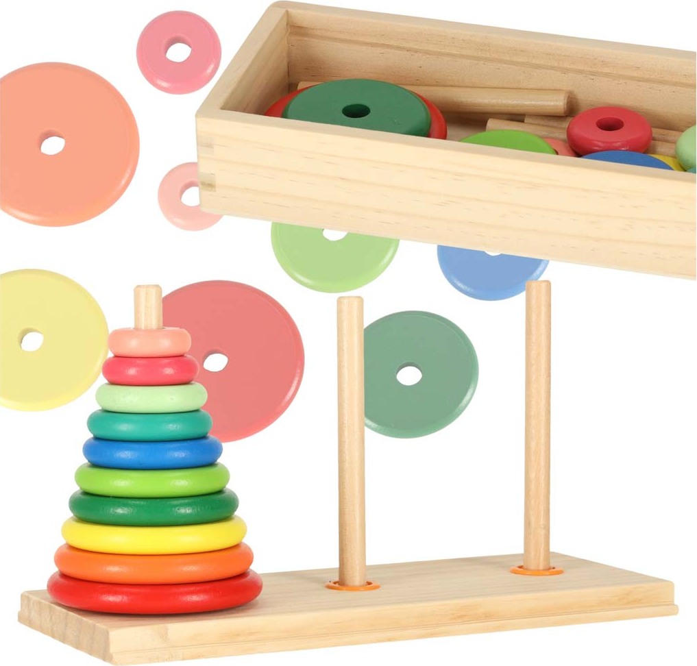 Umisťování disků na tyče pomáhá rozvíjet manuální zručnost a koordinaci ruka-oko. Hraní podle pravidel učí vaše dítě trpělivosti a vytrvalosti. Rozvíjí logické myšlení a pozorovací schopnosti. Podporuje soustředění a může být způsobem, jak uklidnit neklidné batole. Dřevěné hračky, neboli „pomůcky“, jak se jim říká ve filozofii Montessori, jsou příjemně jednoduché, ale zároveň stimulují kreativitu. Podporují intelektuální rozvoj dětí a zároveň poskytují příjemný způsob trávení času.