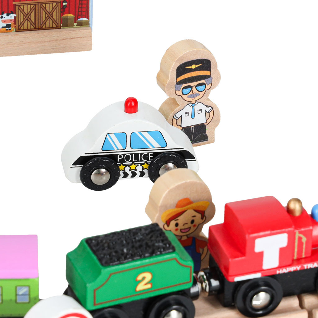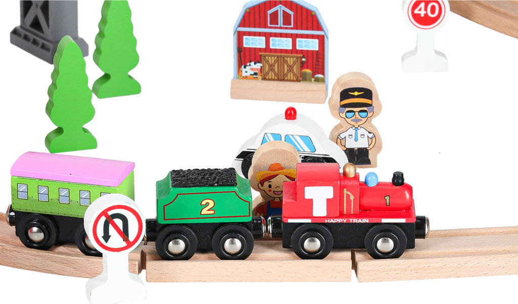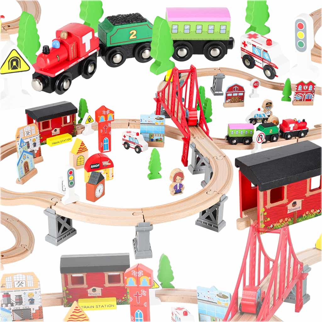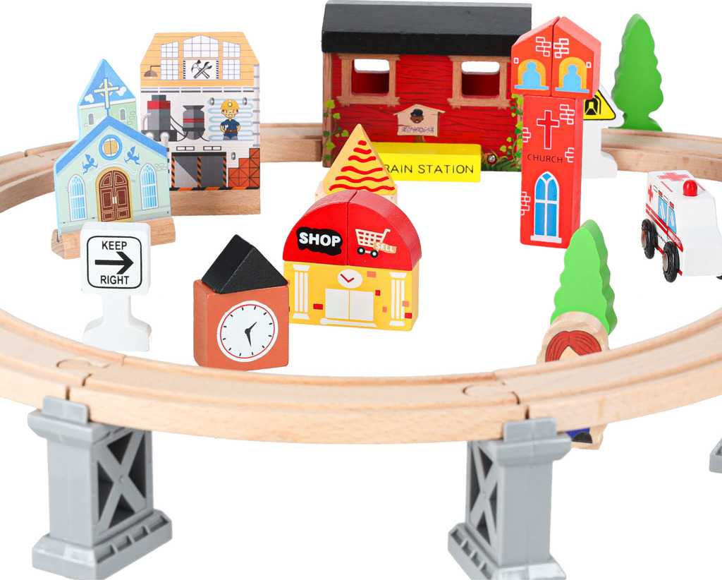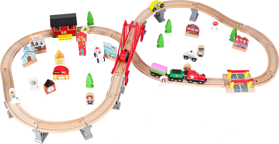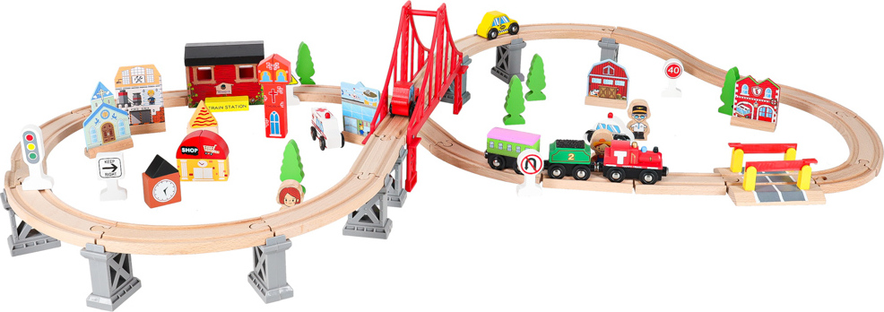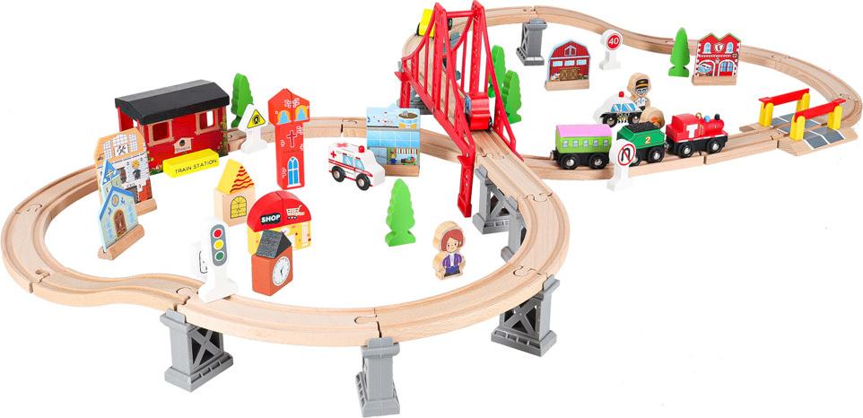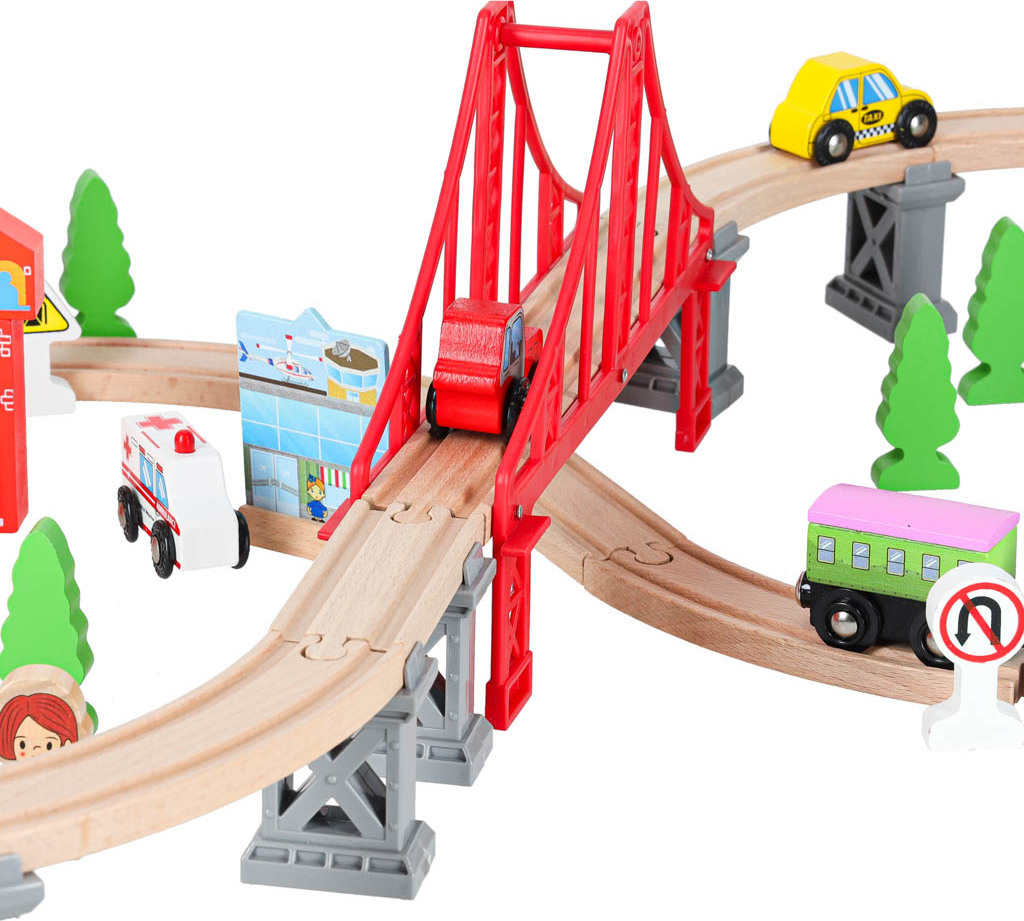 Tato dřevěná vláčkodráha vezme děti na vzrušující cestu plnou kreativní hry! Děti si mohou sama postavit vláčkodráhu a vytvořit si kolem ní vlastní jedinečné město, čímž si rozvíjejí svou fantazii a jemnou motoriku. Sada se skládá z 22 kolejí, včetně výrazného červeného mostu, a také z mnoha doplňků pro větší zábavu. Sada obsahuje lokomotivu se dvěma vagóny, autíčka, budovy, stromy, dopravní značky a tři figurky. Tato hračka podporuje rozvoj jemné motoriky, koordinace rukou a očí a kreativity a zároveň poskytuje hodiny poutavé hry.