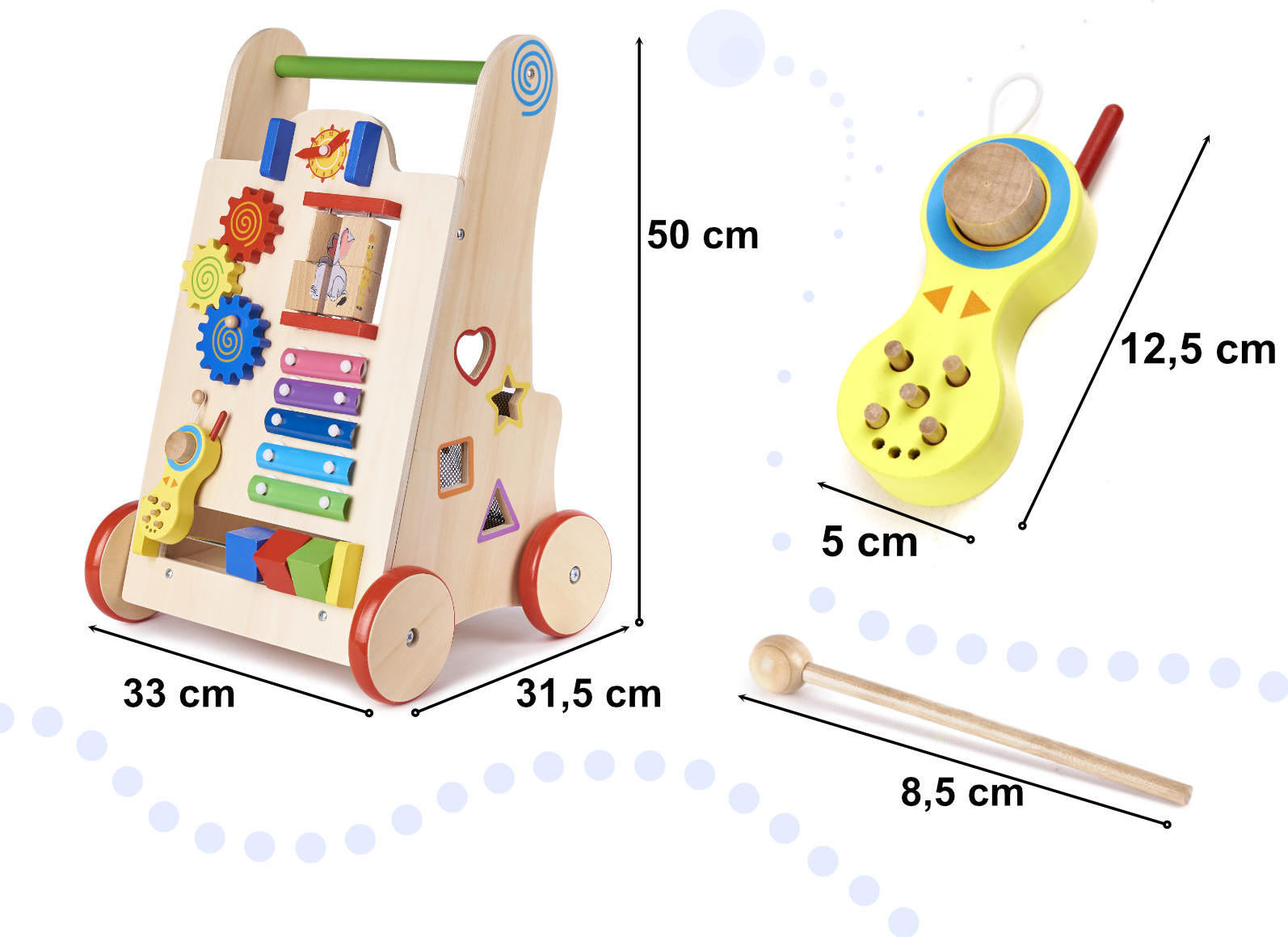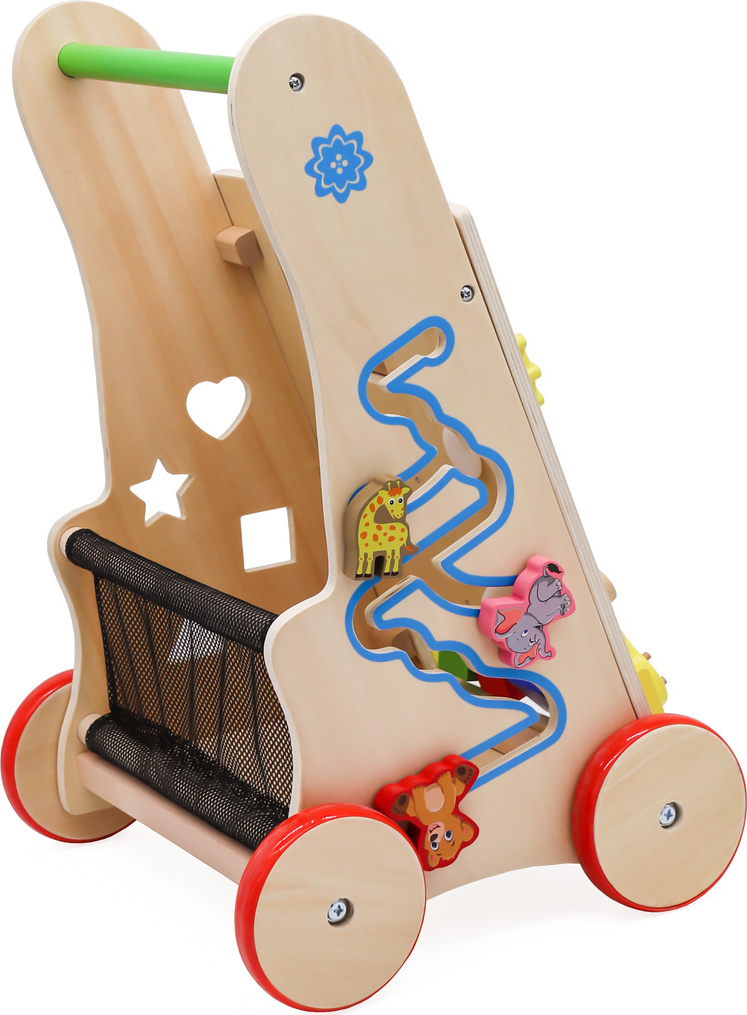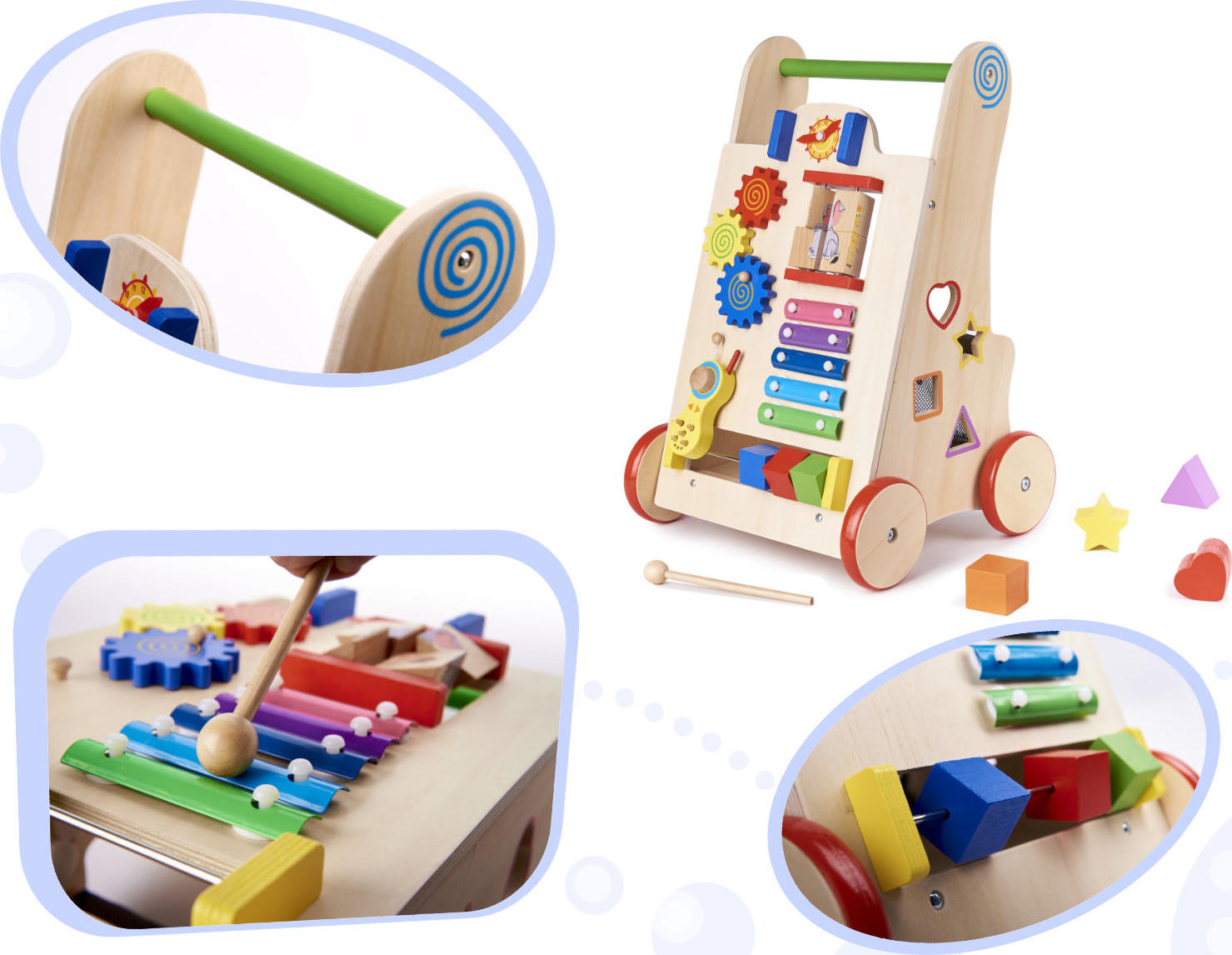Chodítko, které vašemu děťátku pomůže udělat první krůčky. V pozdějším věku se bude hodit také jako vozík na oblíbené hračky a první počítadlo. Chůze s chodítkem pomáhá batoleti udržet rovnováhu při učení se chůzi. Pomáhá rozvíjet manuální dovednosti a rozvíjí motoriku celého těla. Chodítko podporuje fyzickou aktivitu vašeho dítěte. Naše chodítko je stabilní oporou pro batole, které se učí chodit. Dítěti se ji nepodaří převrhnout. Dřevěná kolečka jsou chráněna protiskluzovou gumovou vrstvou. Je funkční a lahodí oku. Estetický design, výrazné barvy, důraz na detail - příjemný a bezpečný společník pro vaše dítě. Toto chodítko se bude líbit rodičům, kteří hledají ekologické doplňky pro své dítě. Dřevěné hračky jsou skvělou volbou!