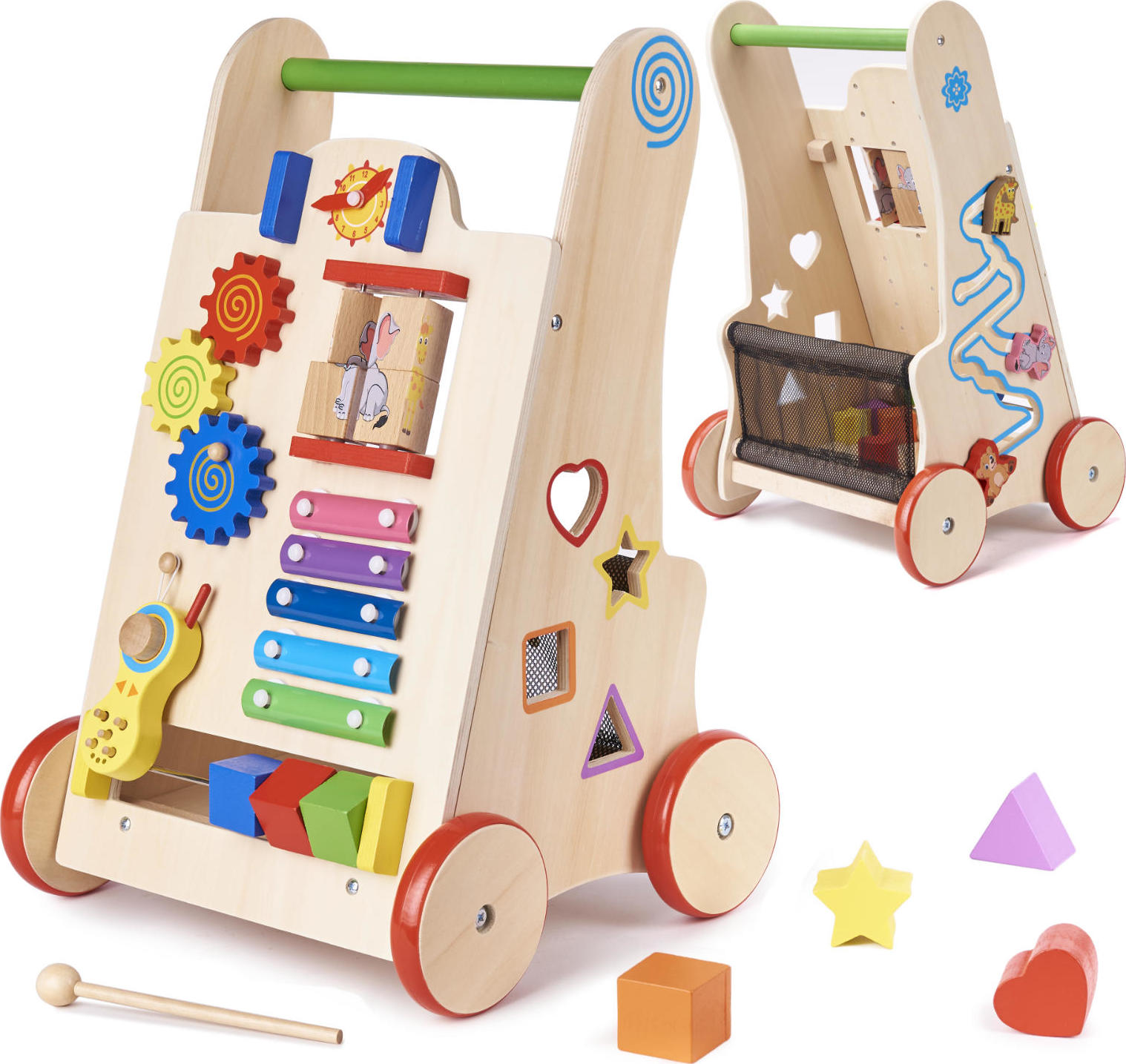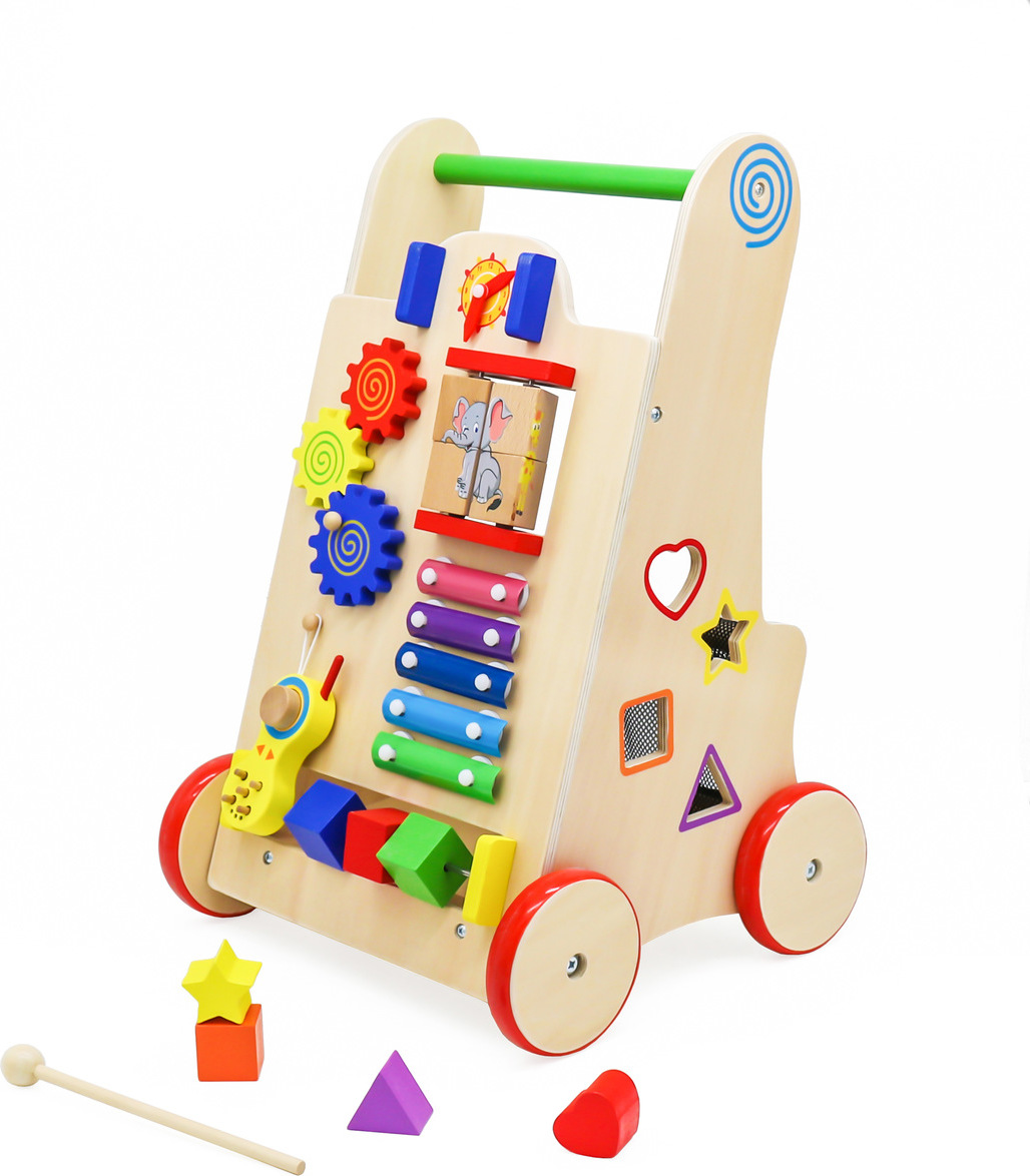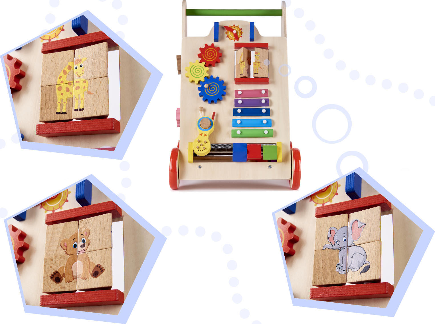 Chodítko, které vašemu děťátku pomůže udělat první krůčky. V pozdějším věku se bude hodit také jako vozík na oblíbené hračky a první počítadlo. Chůze s chodítkem pomáhá batoleti udržet rovnováhu při učení se chůzi. Pomáhá rozvíjet manuální dovednosti a rozvíjí motoriku celého těla. Chodítko podporuje fyzickou aktivitu vašeho dítěte. Naše chodítko je stabilní oporou pro batole, které se učí chodit. Dítěti se ji nepodaří převrhnout. Dřevěná kolečka jsou chráněna protiskluzovou gumovou vrstvou. Je funkční a lahodí oku. Estetický design, výrazné barvy, důraz na detail - příjemný a bezpečný společník pro vaše dítě. Toto chodítko se bude líbit rodičům, kteří hledají ekologické doplňky pro své dítě. Dřevěné hračky jsou skvělou volbou!