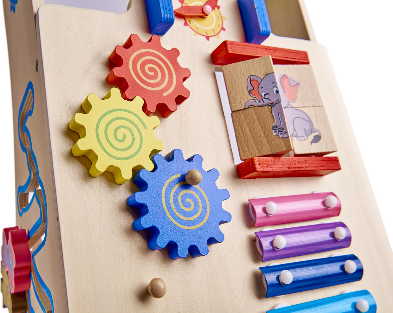 Není to jen chodítko! Tvůrci se postarali o to, aby se batolata bavila mnoha způsoby. Na přední straně kočárku je umístěna manipulační deska plná prvků, které potěší děti: