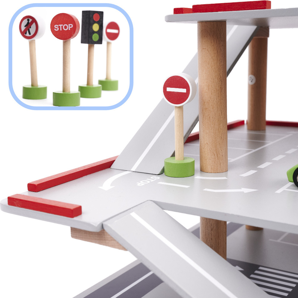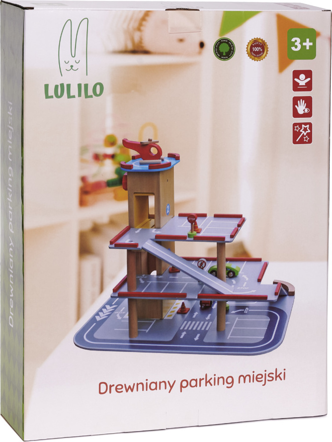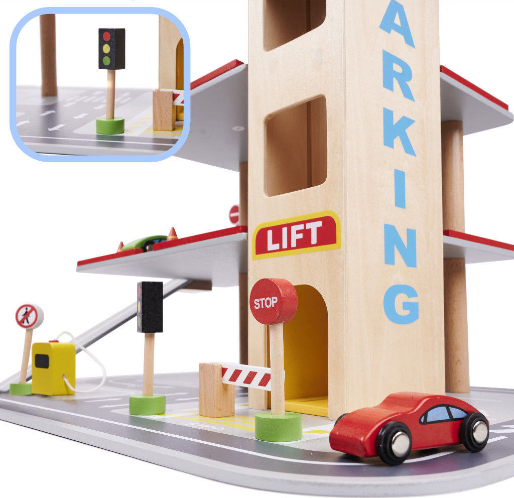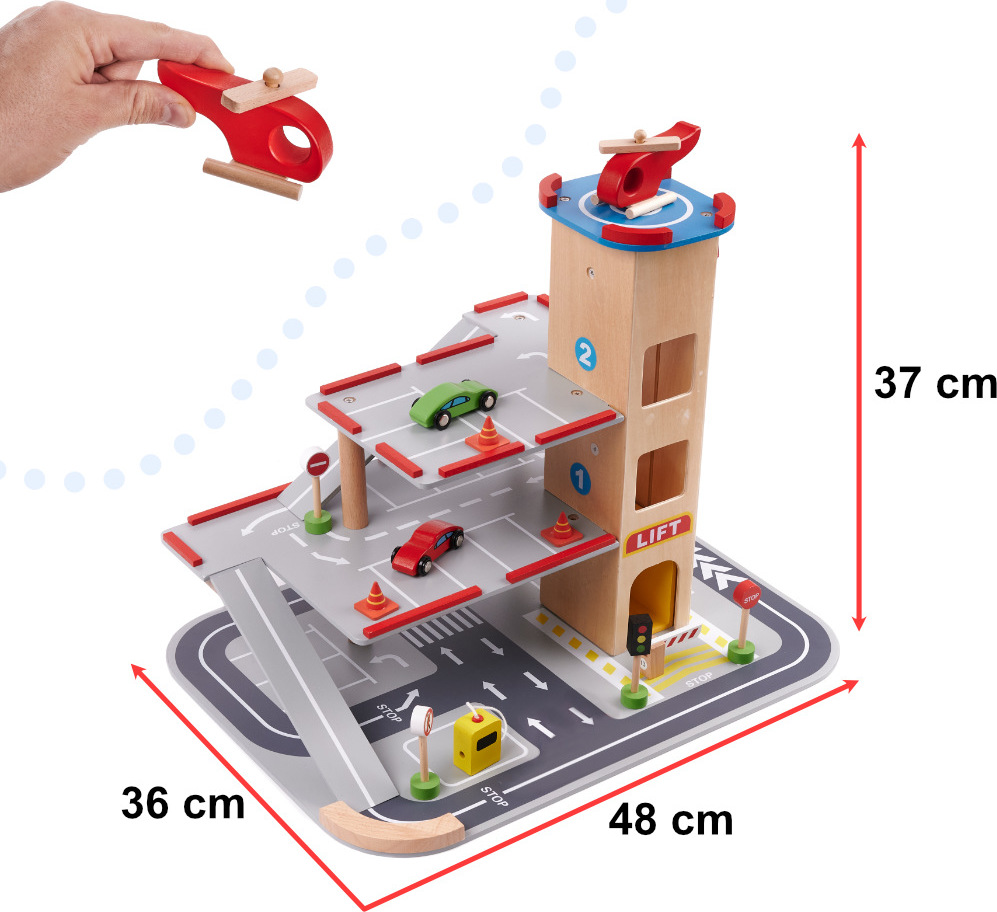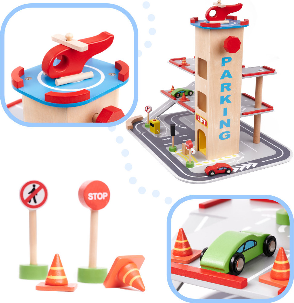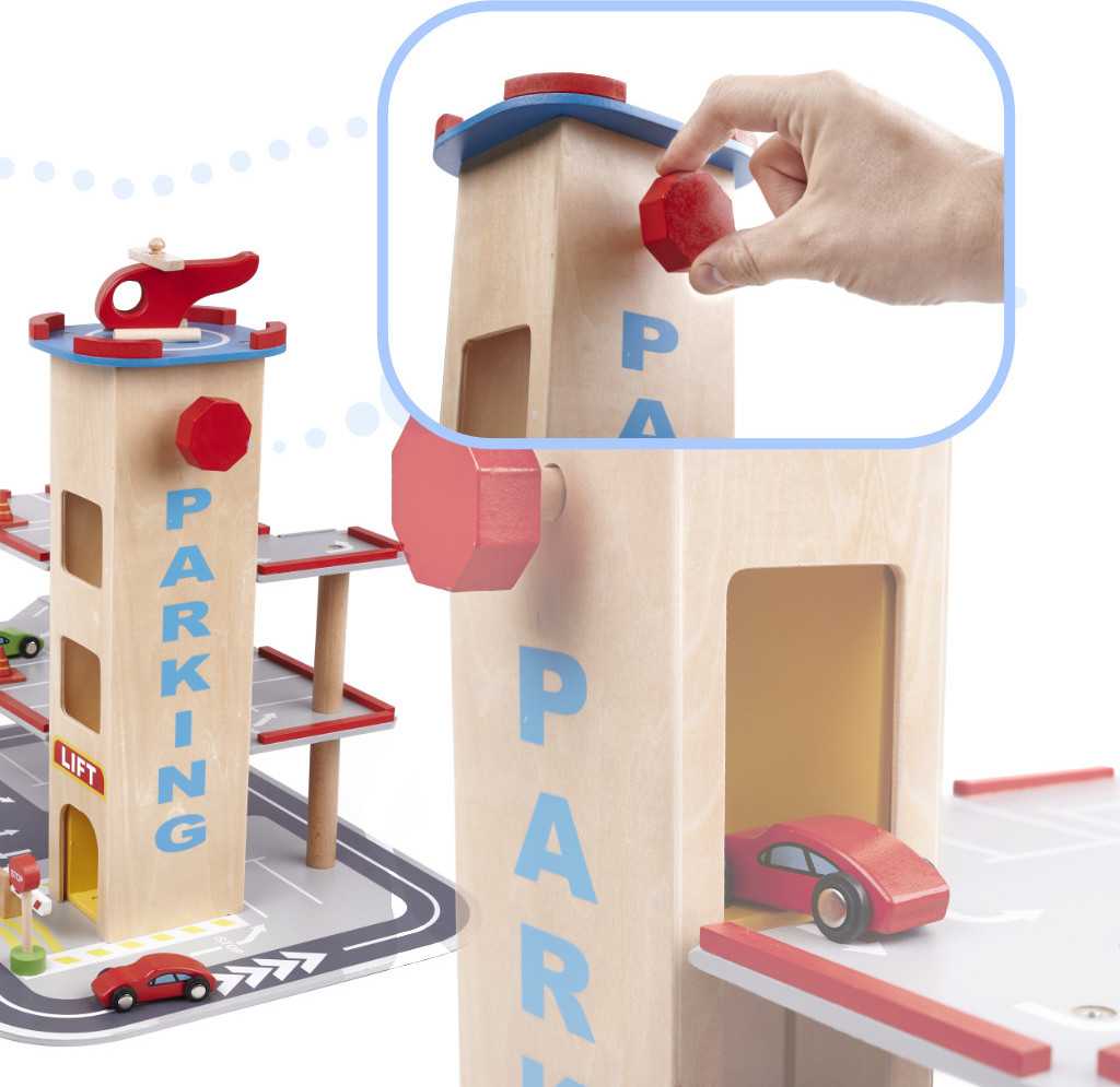 Krásná dřevěná městská garáž má čtyři úrovně! První tři jsou určeny pro autíčka - je zde místo pro dřevěná autíčka, která jsou součástí sady, i pro mnoho dalších vozidel vašeho dítěte. Do dalších úrovní se dostanete výtahem! Na vrcholu stavby je také přistávací plocha pro vrtulníky. Městské parkoviště je vybaveno dalším příslušenstvím, aby zábava nebrala konce! Výdejní stojan na pohonné hmoty - Každé auto musí být přece připraveno na cestu. Než vyrazíte za dalším dobrodružstvím, nezapomeňte ho doplnit! Výtah do dalších úrovní parkoviště. Zvedák se pohybuje nahoru a dolů díky kolečku a umožňuje přepravu jednoho vozu najednou. Na parkoviště mohou vozidla vjíždět také díky rampám.