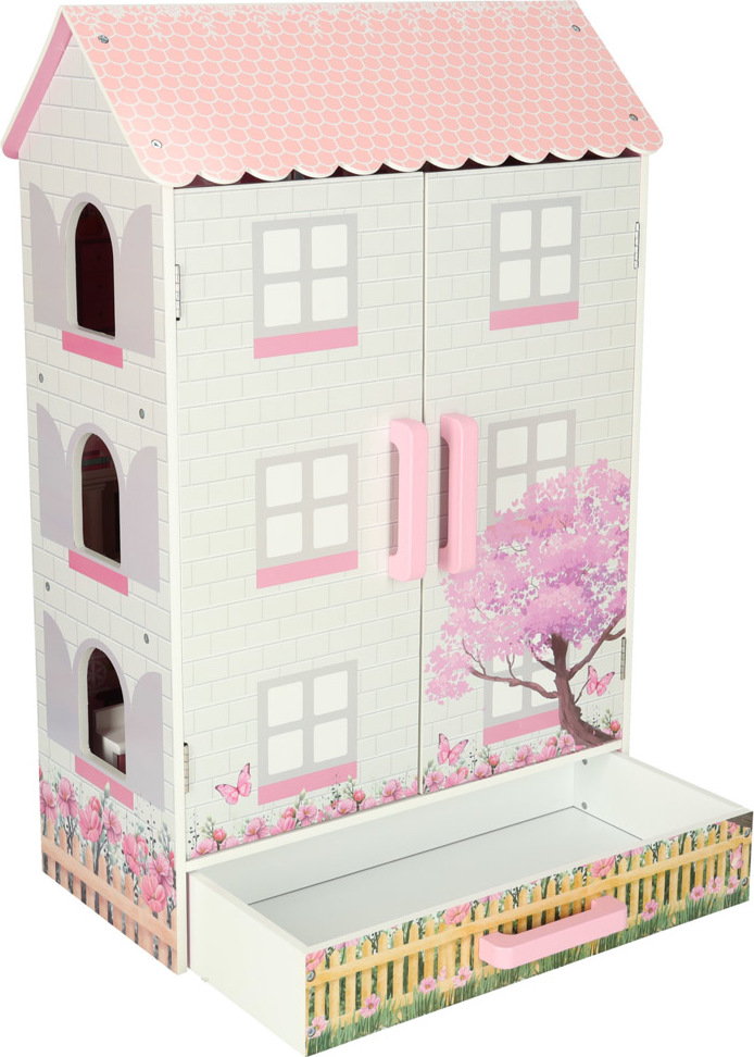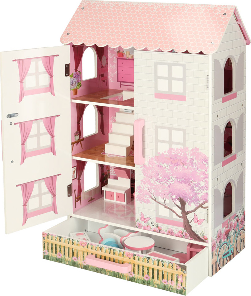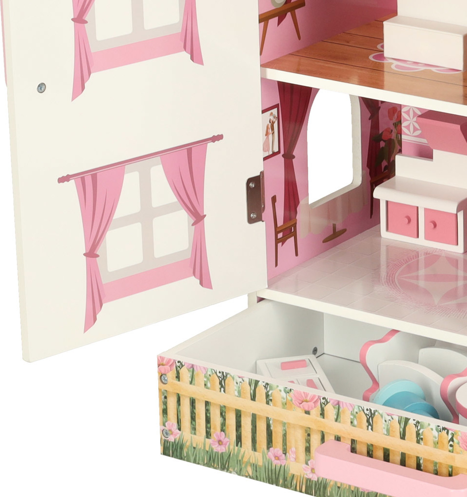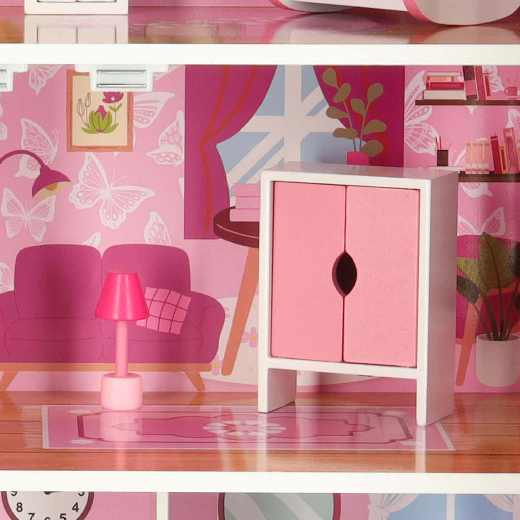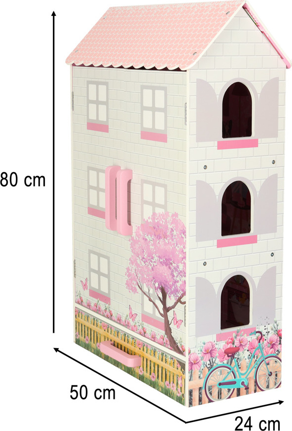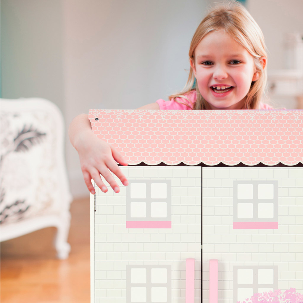 Domeček pro panenky s volitelným nábytkem nabízí spoustu prostoru pro kreativní hraní. Do domečku pro panenky lze také přidat panenky, plyšové medvídky nebo figurky, doplněné barevným nábytkem, a stát se tak protagonisty poutavých příběhů. Růžový, uzamykatelný domeček pro panenky o výšce 80 cm vytváří obrovský vizuální dojem. Domeček má tři patra, včetně kuchyně, obývacího pokoje, koupelny, ložnice a schodiště. Po hraní lze domeček magneticky zavřít, čímž se promění ve stylovou interiérovou dekoraci. Domeček má navíc výsuvnou zásuvku pro uložení nábytku do domečku pro panenky, oblečení pro panenky a dalších doplňků.