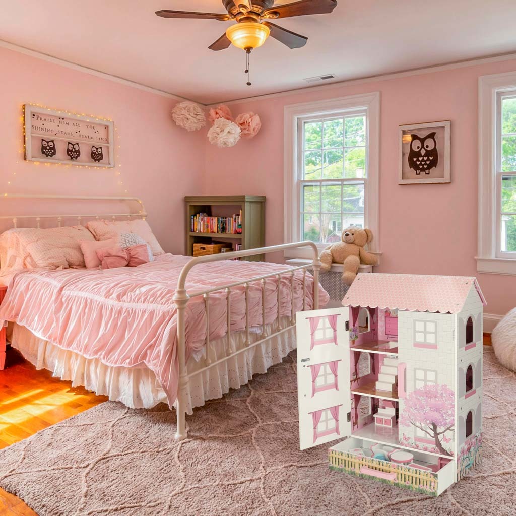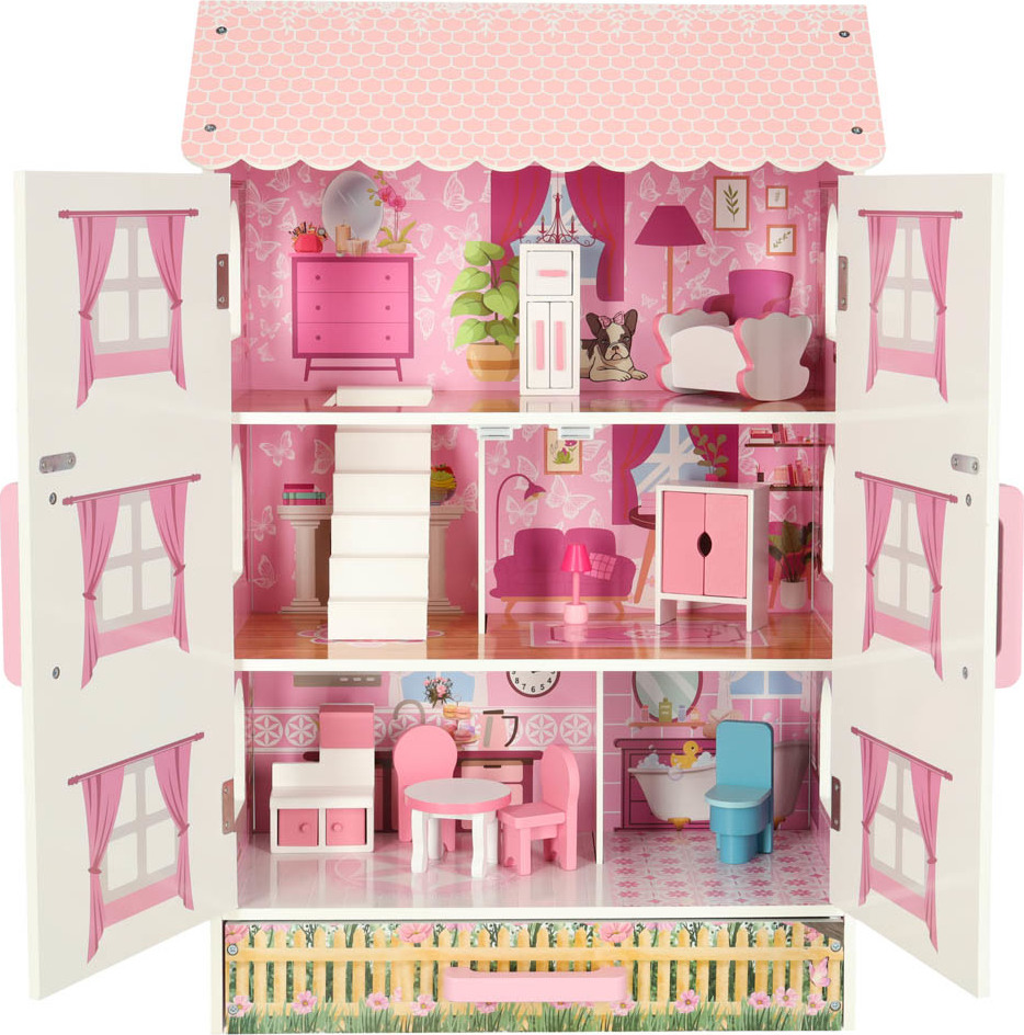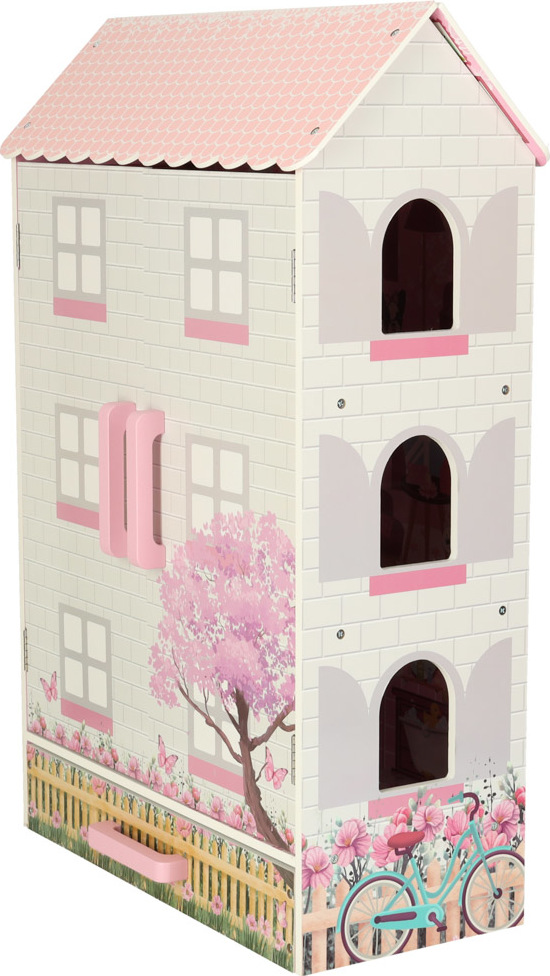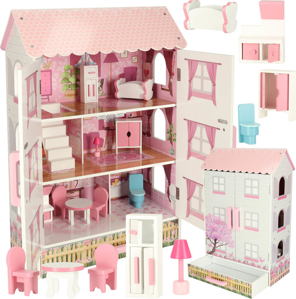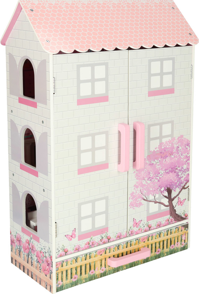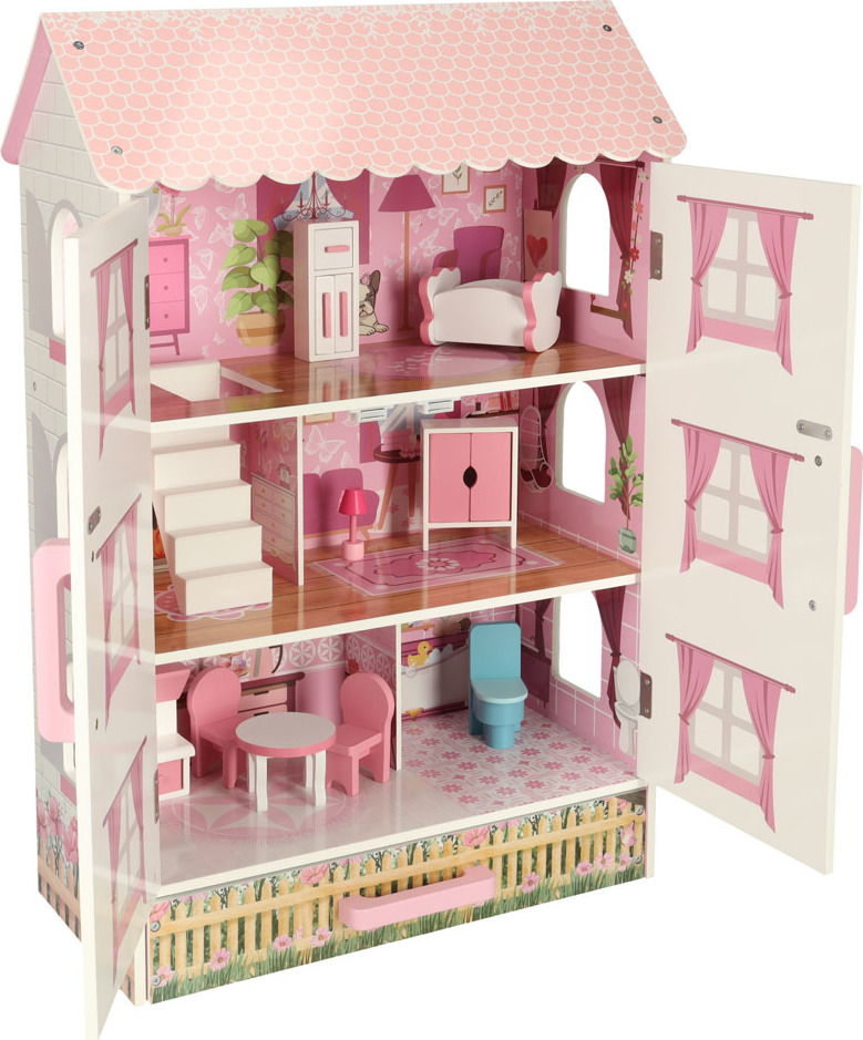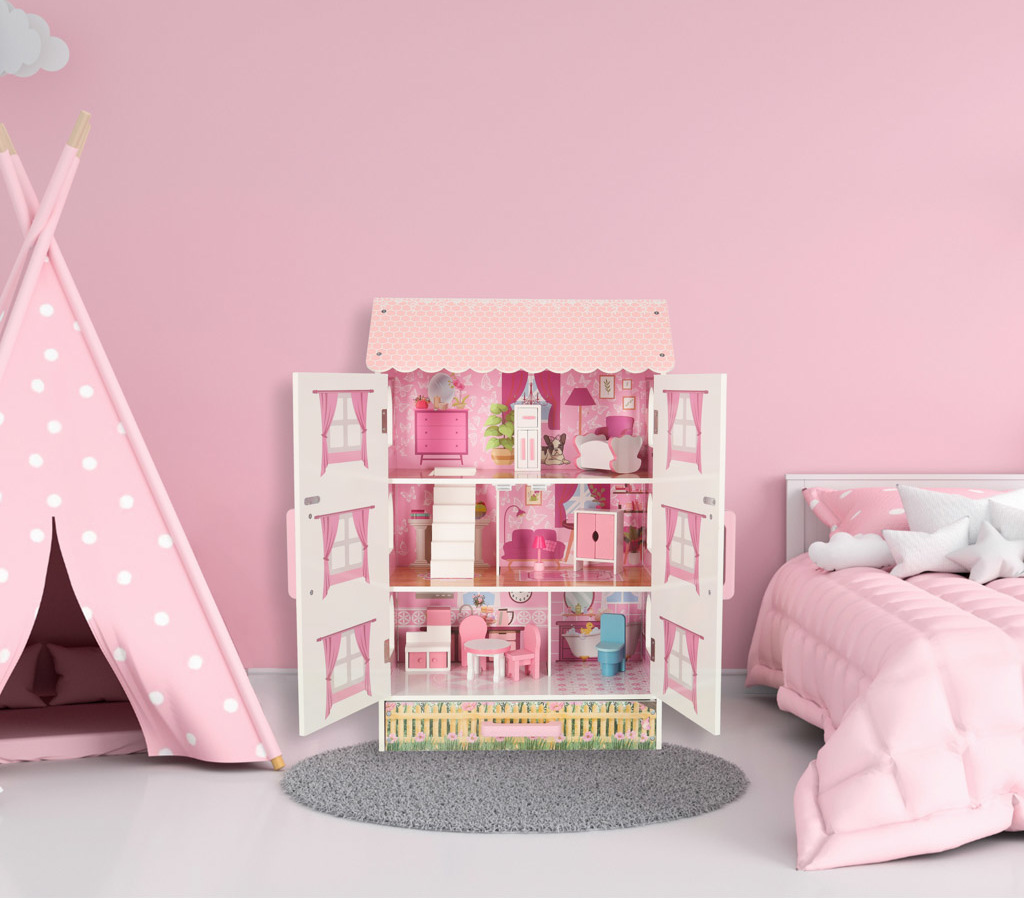 Domeček pro panenky s volitelným nábytkem nabízí spoustu prostoru pro kreativní hraní. Do domečku pro panenky lze také přidat panenky, plyšové medvídky nebo figurky, doplněné barevným nábytkem, a stát se tak protagonisty poutavých příběhů. Růžový, uzamykatelný domeček pro panenky o výšce 80 cm vytváří obrovský vizuální dojem. Domeček má tři patra, včetně kuchyně, obývacího pokoje, koupelny, ložnice a schodiště. Po hraní lze domeček magneticky zavřít, čímž se promění ve stylovou interiérovou dekoraci. Domeček má navíc výsuvnou zásuvku pro uložení nábytku do domečku pro panenky, oblečení pro panenky a dalších doplňků.