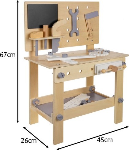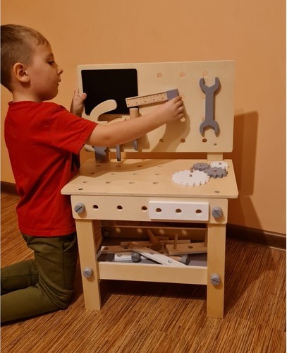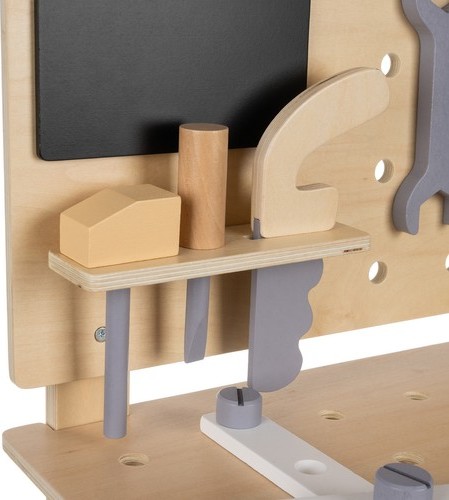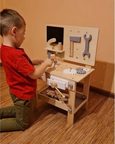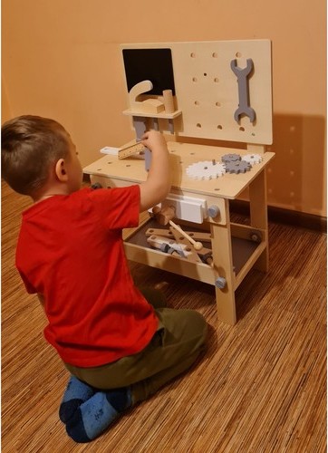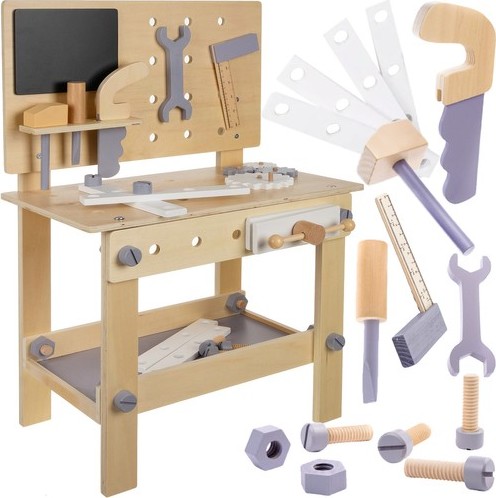 Dřevěná dílna - první krok ke skvělým projektům! Rozvíjejte své malé kutily pomocí dřevěné dílny/ponku plné nářadí! Perfektní sada pro učení hrou - bezpečné, kreativní a ideální pro malé ručičky. Inspirujte k akci pomocí nástrojů, které učí a baví zároveň. Sada byla navržena s ohledem na bezpečnost těch nejmenších, každý prvek je zaoblený a vyrobený z přírodních, netoxických materiálů, které jsou bezpečné pro malé ručičky. Dílenské a dřevěné nářadí je extrémně pevné a odolné vůči intenzivní hře, Díky pevné konstrukci vydrží mnoho hodin kreativního hraní. Sada obsahuje bohaté příslušenství a nářadí jako je šroubovák, kladivo, svěrák, šrouby a matice a dlaší prvky.