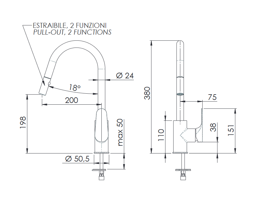 Dřezová stojánková vodovodní baterie FONTI 84DJ s výsuvnou sprchou se 2 funkcemi představuje nadčasový design a kvalitu. Zaoblené ramínko jí dodává vzhled, který nikdy neomrzí. Otočná dřezová stojánková baterie FONTI 84DJ s 2-funkční výsuvnou sprchou vyniká vysoce kvalitním zpracováním a spolehlivou funkčností všech součástí a materiálů.