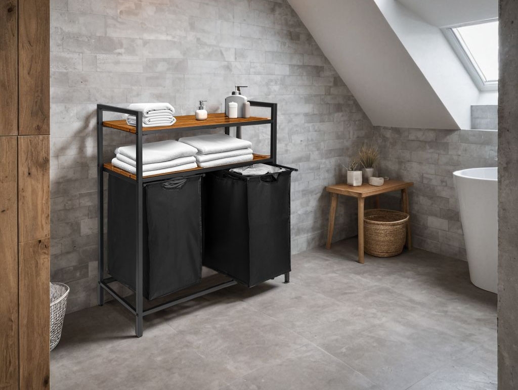 Dvoukomorový koš na prádlo s policemi Mirun je výbornou volbou pro lidi, kteří hledají funkčnost v kombinaci s elegantním designem. Se dvěma přihrádkami usnadňuje třídění oblečení a další police nabízejí místo na ručníky nebo koupelnové doplňky. Jeho odolná konstrukce a loftový styl se dobře hodí k různým uspořádáním interiéru a dodávají jim industriální charakter. Koš Mirun vám umožní ušetřit místo a udržet pořádek v koupelně.