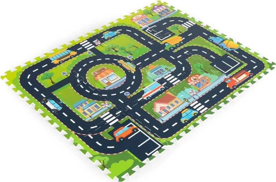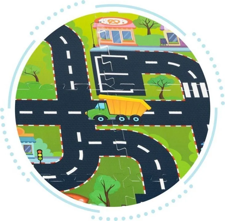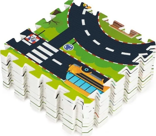 Pěnové puzzle s potiskem městečka s jeho ulicemi pro děti od 12 měsíců. Balení obsahuje 12 čtvercových dílů. Bezpečná a měkká podložka je omyvatelná, tlumí hluk a izoluje od chladu, je proto ideální jako hrací koberec nejen do dětských pokojů. Puzzle má vroubkovaný povrch s barevným potiskem.