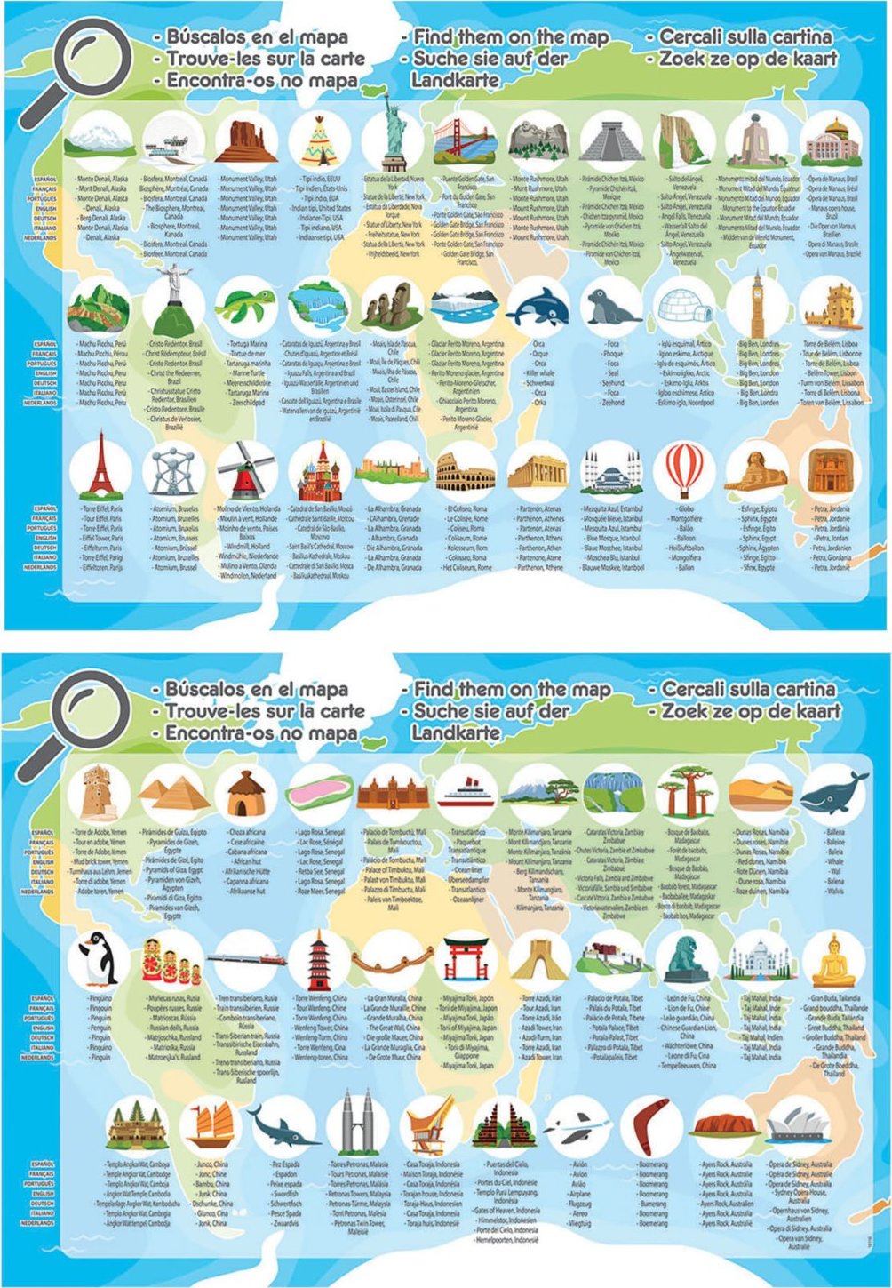 Zeměpisné puzzle pro děti s mapou světa a ilustracemi v podobě světových památek a turisty vyhledávaných míst. Na puzzle najdete Eiffelovku, pyramidy nebo třeba Sochu Svobody. Názvy kontinentů a oceánů jsou v anglickém jazyce. Součástí balení je i informační leták s názvy oblíbených turistických cílů (španělsky, francouzsky, portugalsky, anglicky, německy, italsky, nizozemsky). Jakmile puzzle poskládáte, můžete si zahrát na hledání obrázků. Kdo je najde všechny? Rozměr složeného puzzle cca 48 x 34 cmVlastnosti
