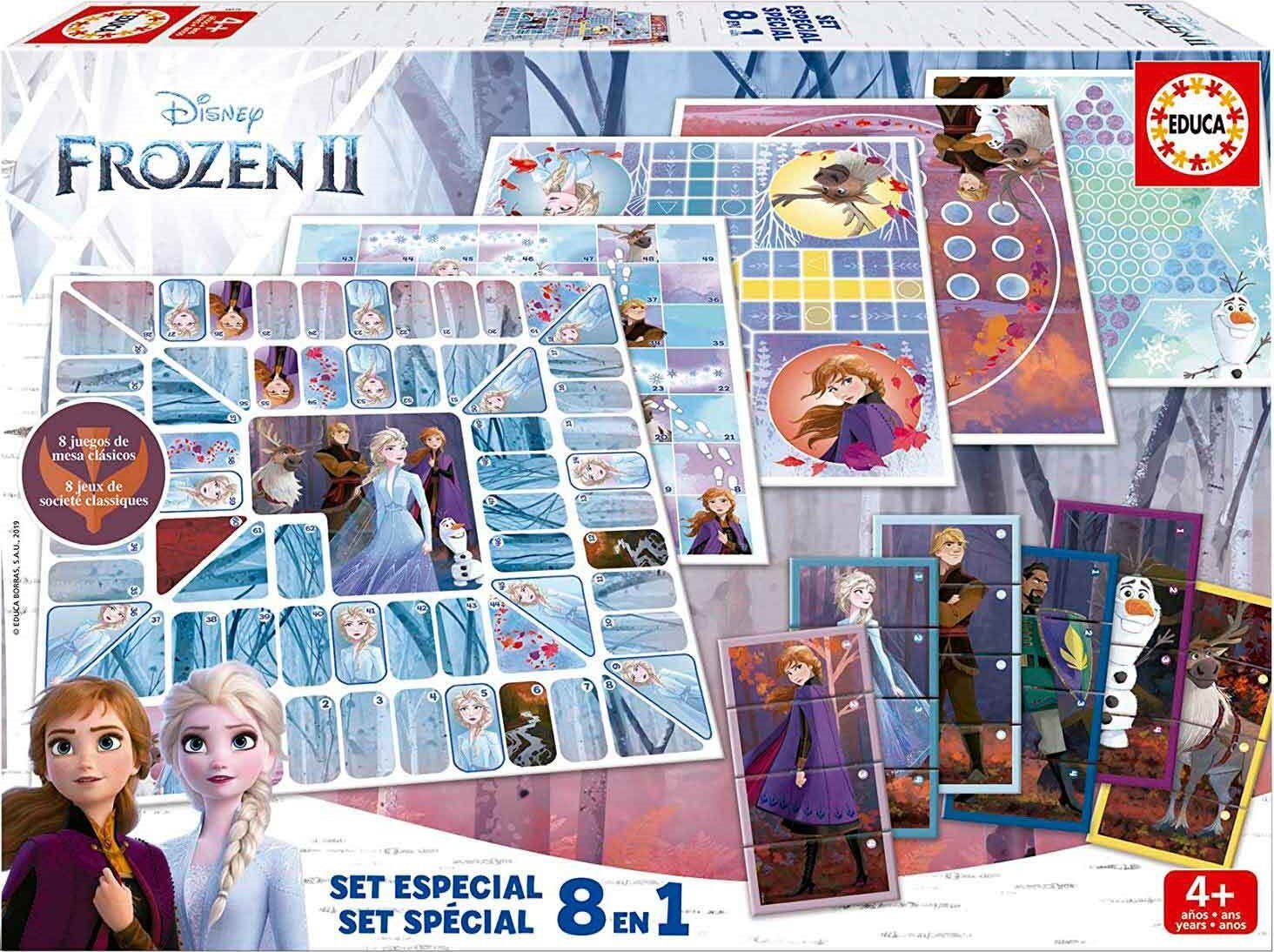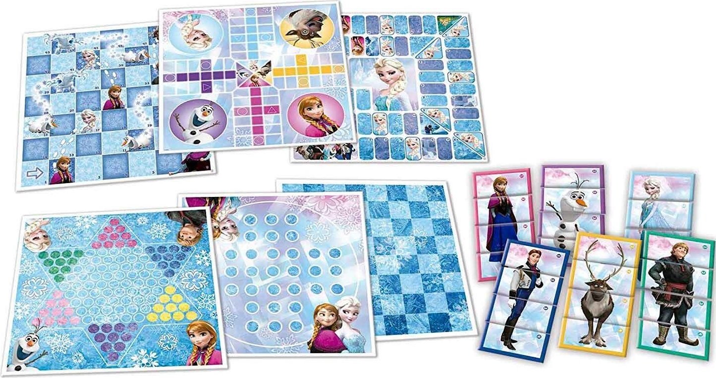 EDUCA SuperPack 8v1 - to je skvělá zábava nejen pro děti! Soubor 8 různých stolních her s postavami z Ledového království. Se souborem her EDUCA si můžete zahrát variantu Člověče, nezlob se (Parcheesi), Dámu, dětskou hru Hadi a žebříky, Husičky, Kočku a myš, variantu halmy (Čínská dáma), Solitér a Postavy. Obsah balení: 6 herních plánů (očíslováno 1-6) 82 malých žetonů pro 6 postav (10 pro každou postavu plus 22 dílků navíc) 4 středně velké žetony pro 4 postavy (1 pro každou postavu) 24 velkých žetonů pro 2 postavy (12 pro každou postavu) 24 dílků pro 6 postav (4 pro každou postavu) 1 kostka český návodVlastnosti