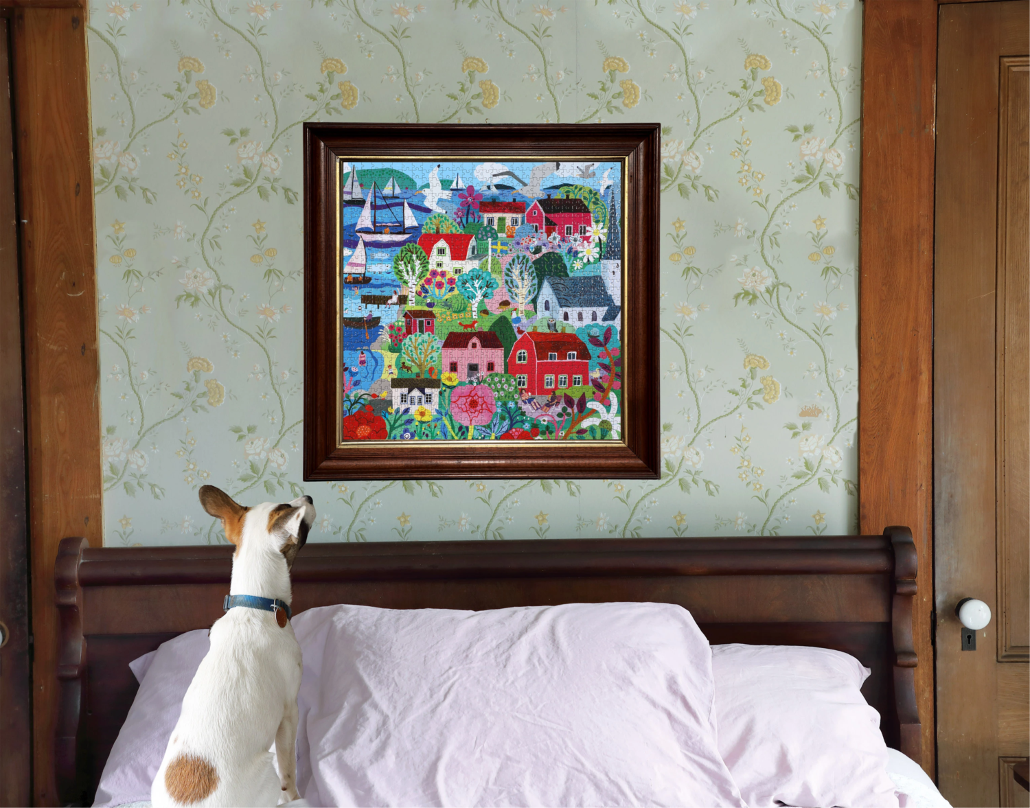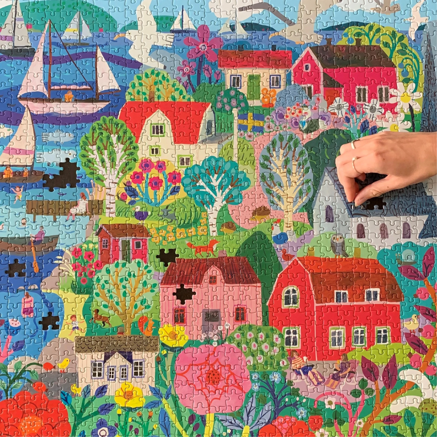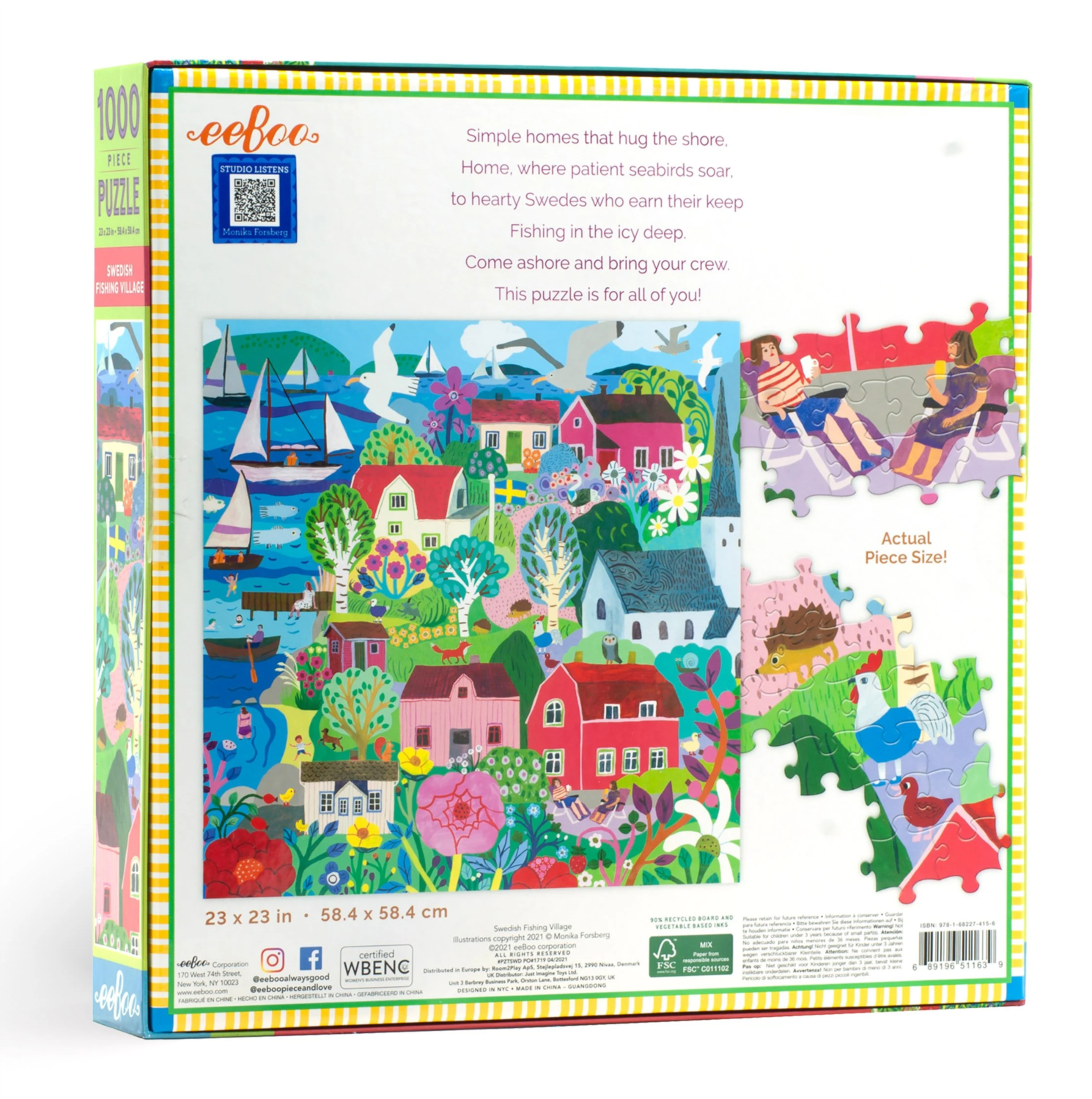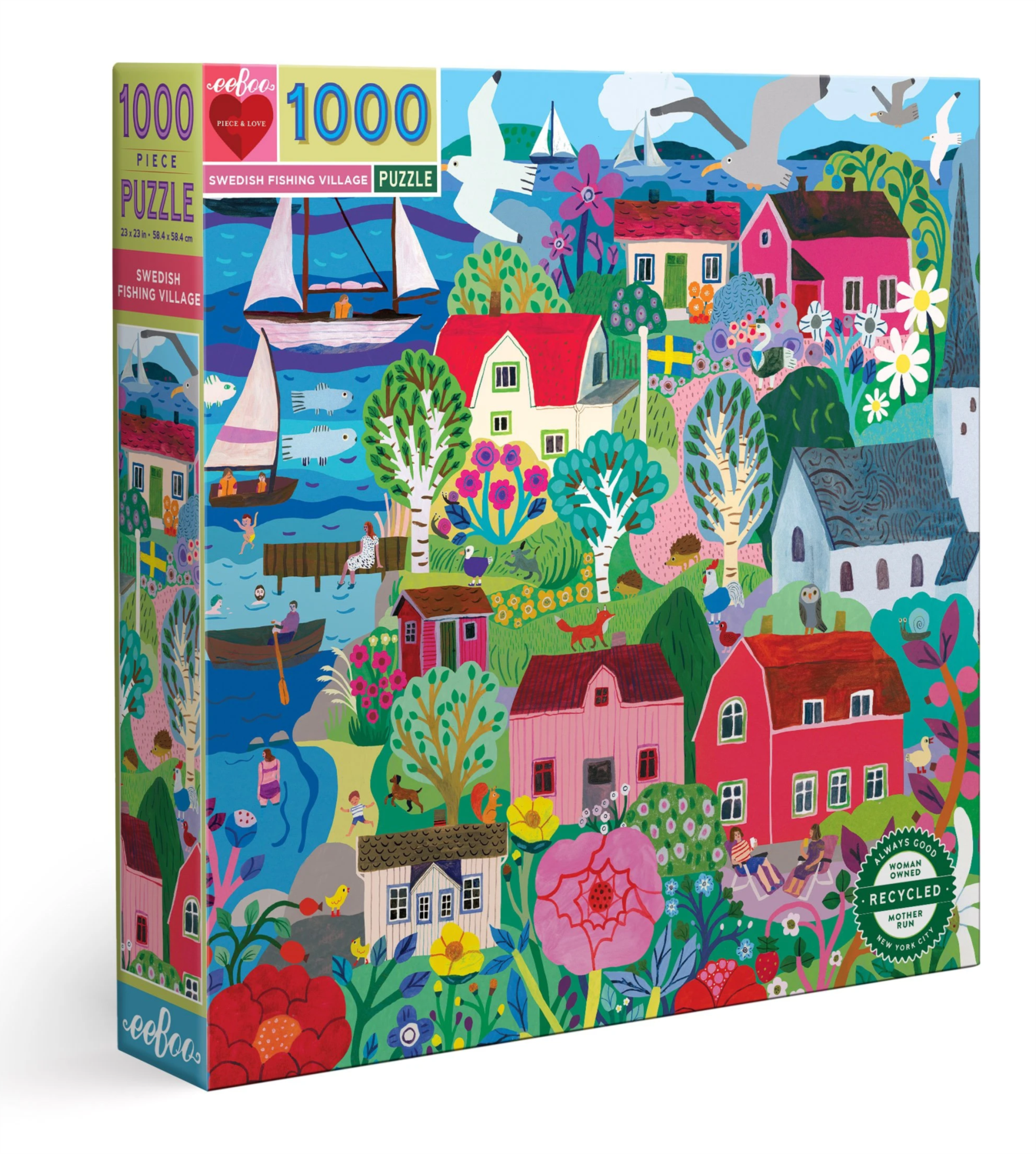 Autorka díla Monika Forsberg zachycuje pohled na svůj poklidný domov. Veselé barvy vesničky se odráží ve vodě a zelená tráva v dokonalém kontrastu barevných domů, stodoly a kostela dodává dílu jarní svěžest. Skládání tohoto pestrého díla bude příjemně strávený čas. Vyrobeno z 90% recyklovaného šedého kartonu a tišteno inkousty na rostlinné bázi. Puzzle od amerického výrobce EEBOO. Rozměr složeného puzzle cca 58,4 x 58,4 cmVlastnosti