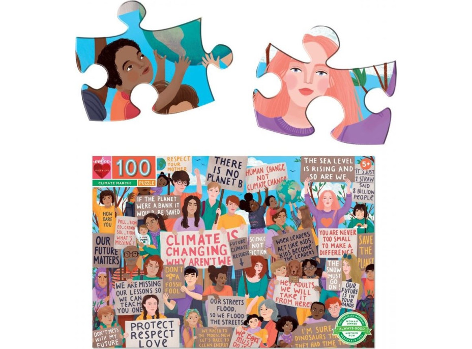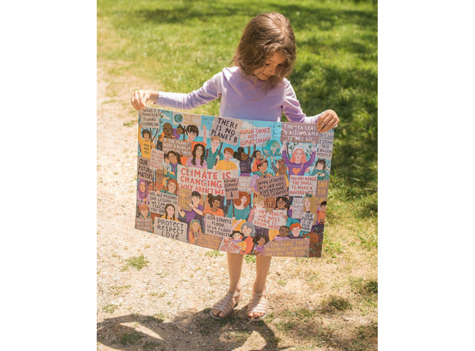 Originální puzzle, které znázorňuje protest za lepší klima. Materiál: vyrobeno z 90% recyklovaného šedého kartonu a tišteno inkousty na rostlinné bázi. Puzzle od amerického výrobce EEBOO. Vhodné pro děti od 5 let. Rozměr složeného puzzle cca 68,5 x 45,7 cmVlastnosti