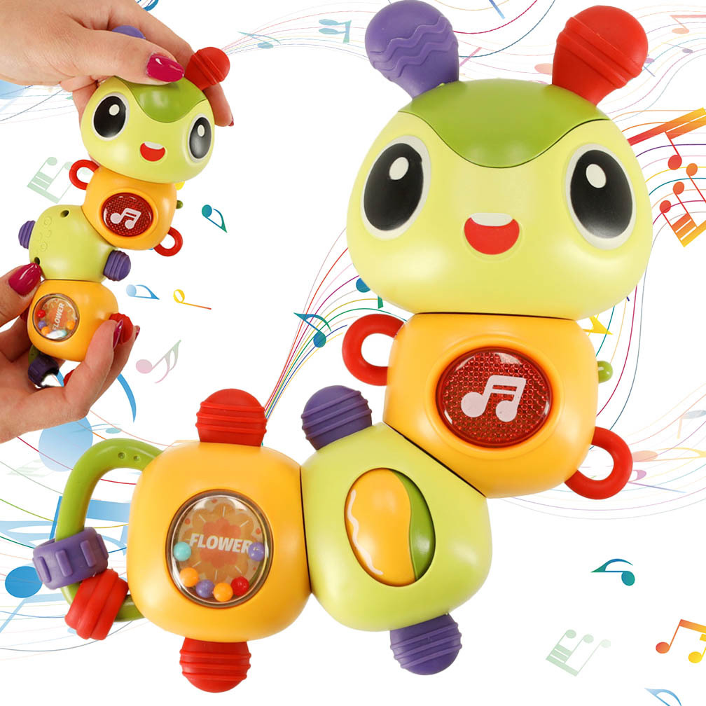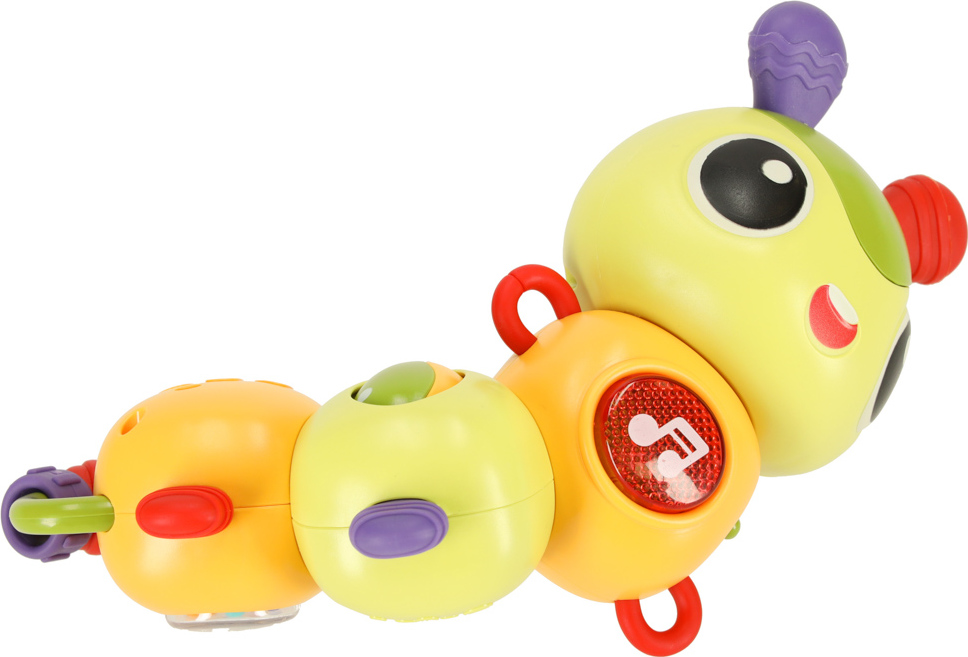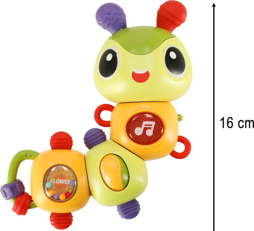 Tato barevná housenka je ideální pro nejmenší a nabízí spoustu možností interakce. Jednotlivé prvky lze kroutit a vytvářet tak zábavné tvary. Součástí je chrastítko s míčky, korálky na klouzání a tlačítko s notami, které po stisknutí přehrává veselé melodie. Je napájena dvěma bateriemi AAA (nejsou součástí balení). Hraním si děti rozvíjejí manuální dovednosti a smysly.