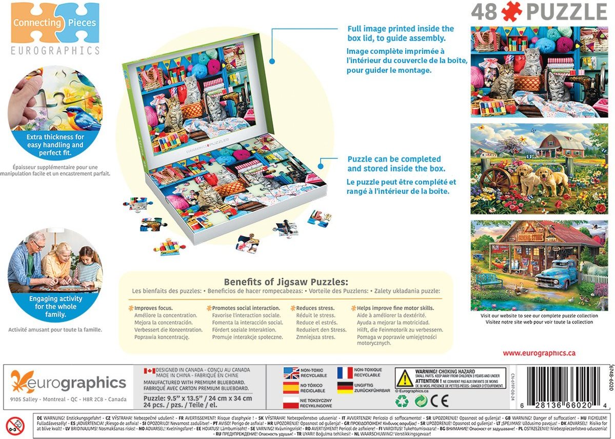 Puzzle z kolekce Connecting Pieces od výrobce Eurographics, která je speciálně navržena, aby podporovala kognitivní dovednosti, jemnou motoriku a sociální interakci. Puzzle tak nejsou pouze zábavou, ale také vhodnou pomůckou pro mentální trénink, snižování stresu a zlepšení koncentrace. Díky velkým dílkům se jedná o ideální volbu pro seniory nebo pro osoby s demencí nebo osoby s omezenou motorikou.