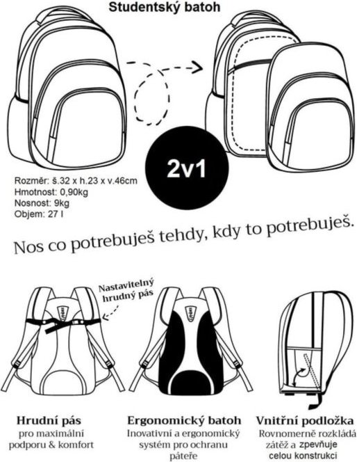 Multifunkční batoh 2v1 VIKY! Studentský batoh 2v1 VIKY je dvoudílný a tříkomorový. Dvoudílný (2v1) znamená, že zip u prostřední komory jde buď úplně rozepnout a tím se rozdělí batoh na dva. Nebo se rozepne jen částečně a slouží jako plnohodnotný tříkomorový batoh. Větší batoh má zádovou část s polstrováním a ergonomickým systémem pro ochranu páteře. Široké nosné řemeny jsou opatřeny výškově nastavitelným spojovacím prsním páskem. Dno batohu má vnitřní podložku, která zpevní jeho celkovou konstrukci a zajistí stabilitu batohu při jeho postavení na zem. Na předním dílu je pak velká kapsa na zip. Menší batoh, má organizér našitý na velké vnitřní kapse. Organizér tvoří kapsička na mobil, kapsička na zip a místo na psací potřeby. V horní části je upevněna karabinka na klíče. Na předním dílu batohu je kapsička na zip. Zádová část je polstrována v celé ploše. Batoh má dvě síťované volně přístupné boční kapsy v horním okraji se všitou gumou. Reflexní prvky jsou jak na předním dílu, tak i na nosných řemenech. Váha batohu: 0,9 kg Nosnost batohu: 9 kg Objem batohu: 27 l Rozměry batohu: 32 x 22 x 46 cmVlastnosti