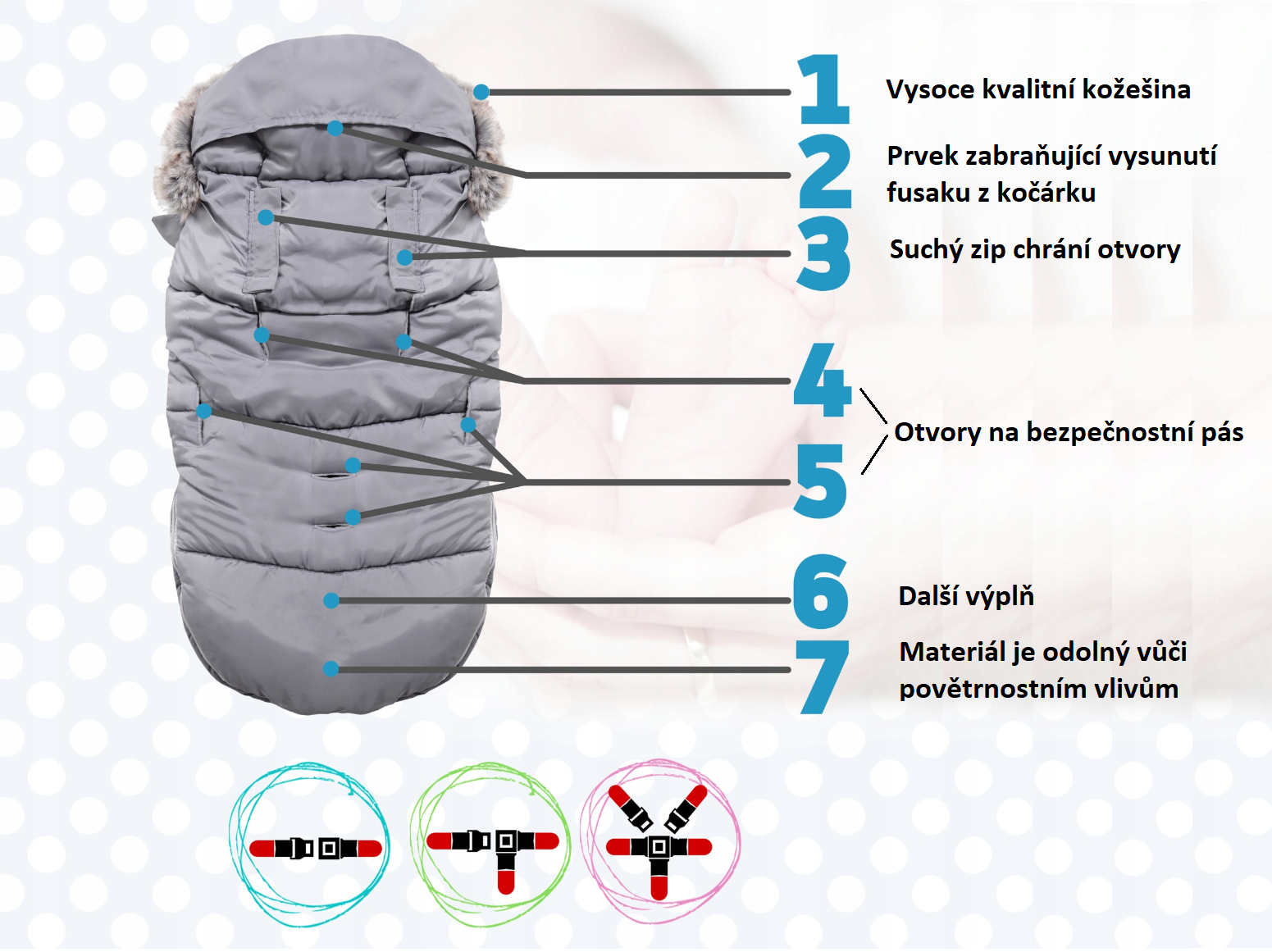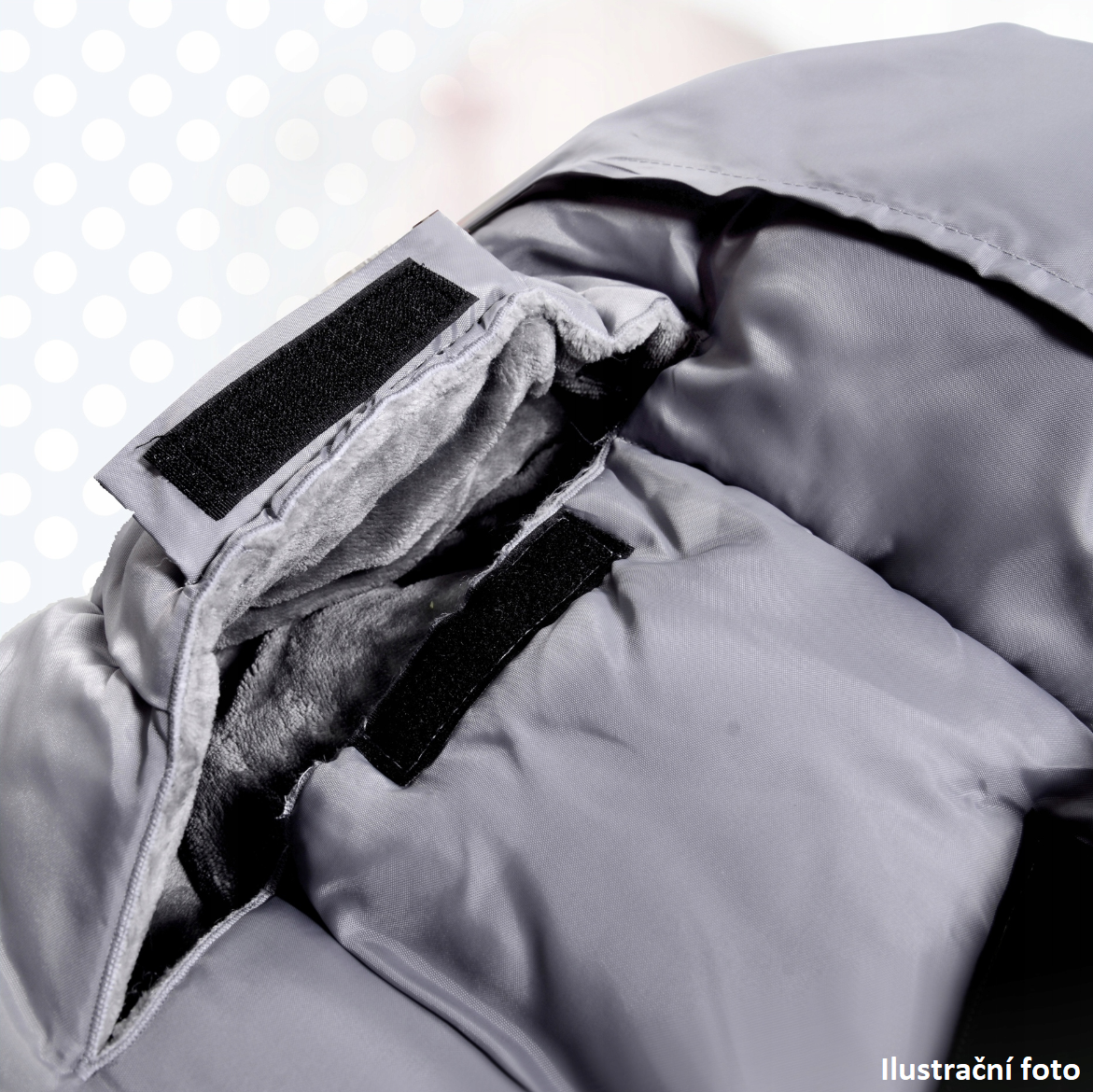 - Fusak má otvory na zapínání do autosedačky nebo kočárku