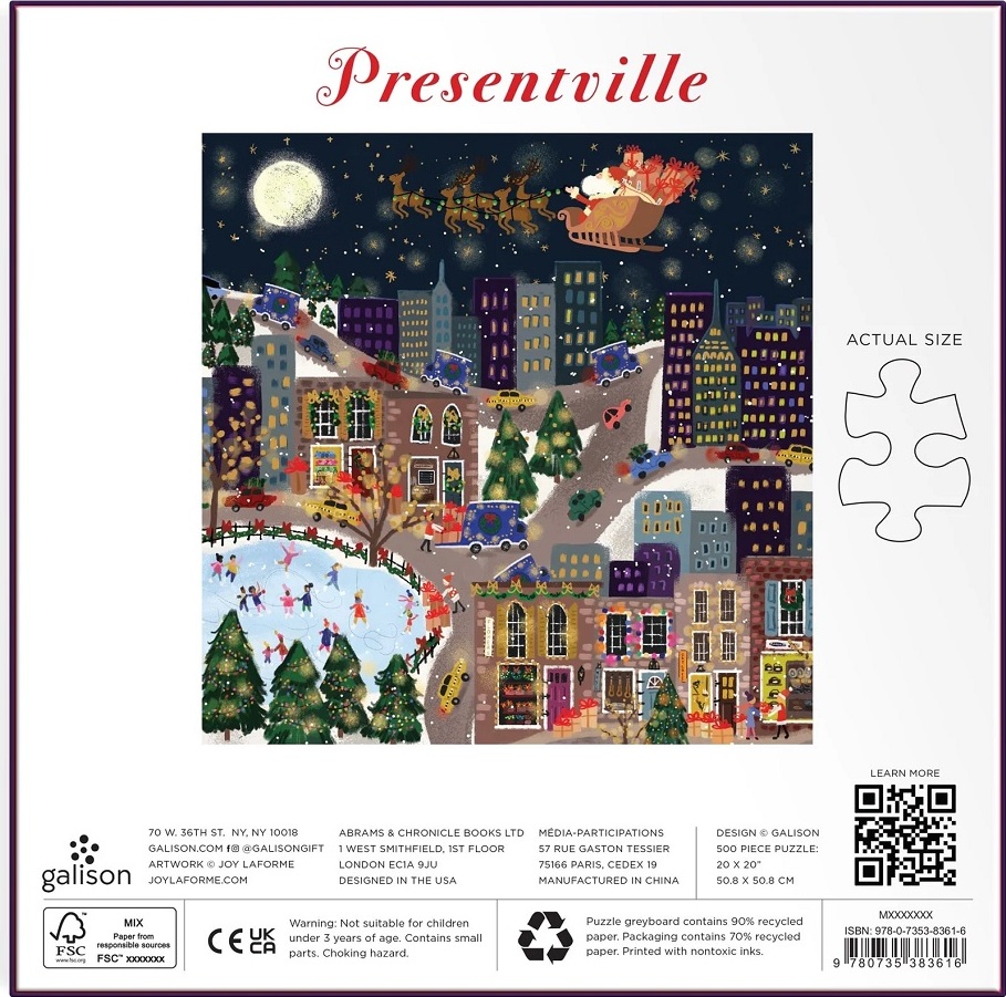 Vstupte do kouzelného zimního městečka s puzzle Presentville od značky Galison. Tato detailní sváteční ilustrace zachycuje živé město během Vánoc – lidé bruslí na zamrzlém kluzišti, ulice jsou plné světýlek a nad městem prolétá Santa Claus se svými soby.Ilustrace je plná drobných detailů a doplněná o metalické fóliové prvky, které dodávají scéně jemný třpyt a slavnostní atmosféru. Skládání puzzle je tak nejen zábavné, ale i relaxační, ideální pro dlouhé zimní večery. Puzzle Presentville potěší každého milovníka zimních scenérií, ilustrací a vánoční atmosféry. Po dokončení může posloužit i jako krásná sezónní dekorace. Dílky jsou pevné a odolné a přesně do sebe zapadnou. Puzzle je vyrobeno zodpovědně za použití vysokého podílu recyklovaného materiálu (90 % puzzle a 70 % obal) s certifikací FSC® a je potištěno netoxickými barvami.