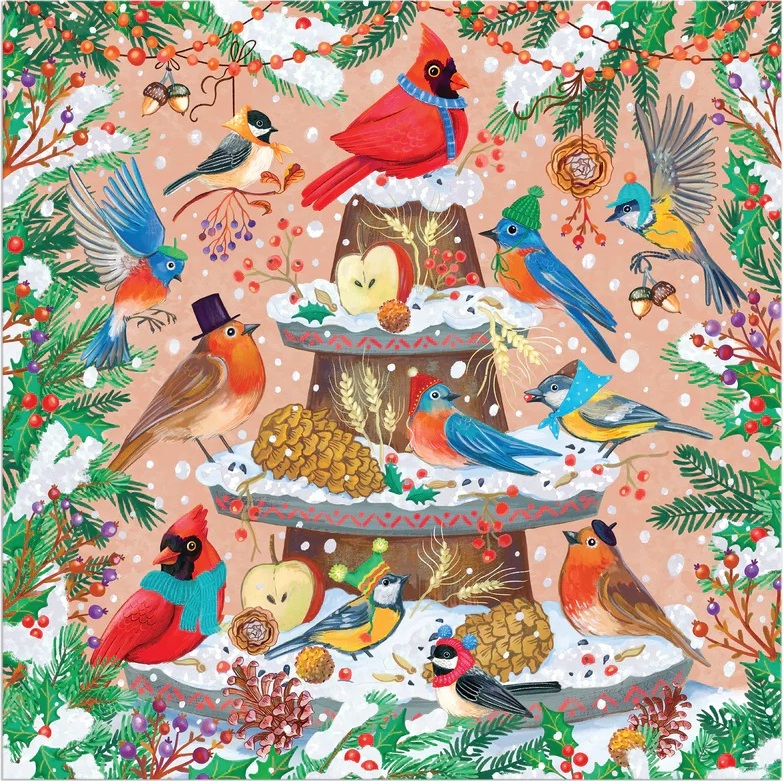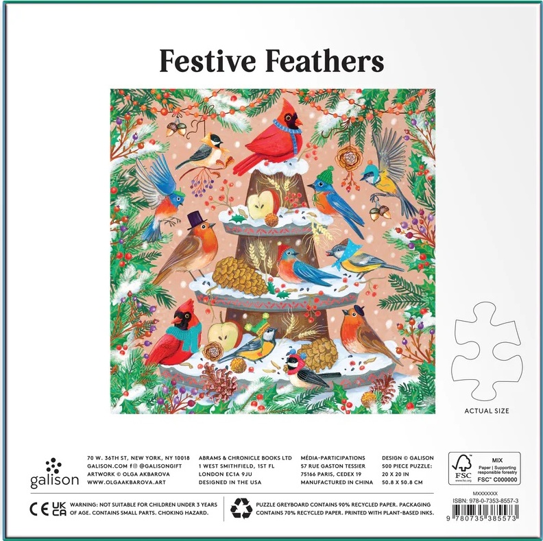 Užijte si kouzelnou zimní atmosféru s puzzle Zimní ptáci od značky Galison. Tato nádherně ilustrovaná skládačka s 500 dílky zachycuje pestrou skupinu zimních ptáků posedávajících kolem zasněženého krmítka obklopeného šiškami, větvičkami a sváteční výzdobou. Ilustrace je doplněna o metalické fóliové detaily, které dodávají puzzle luxusní vzhled a jemně se třpytí při dopadu světla. Díky tomu je skládání ještě příjemnější a výsledný obrázek působí jako dekorativní zimní ilustrace. Puzzle je ideální pro zimní večery, rodinné chvíle nebo relaxaci při skládání. Po dokončení může sloužit také jako krásná sezónní dekorace. Dílky jsou pevné a odolné a přesně do sebe zapadnou. Puzzle je vyrobeno zodpovědně za použití vysokého podílu recyklovaného materiálu (90 % puzzle a 70 % obal) s certifikací FSC® a je potištěno netoxickými barvami.
