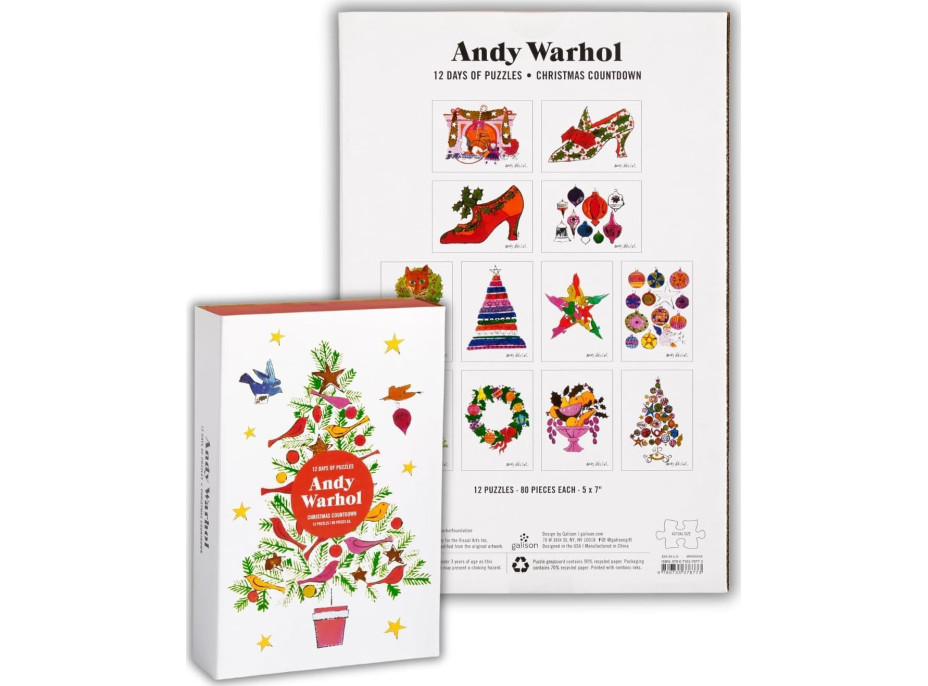 12ti denní Adventní kalendář obsahuje 12 balení puzzle s Warholovými rozmarnými vánočními obrazy, kresbami a grafikami z 50. let. Po sejmutí vnějšího obalu se objeví předlohy a samotný adventní kalendář s 12 tradičními okýnky. Každý den otevřete jedno, poskládáte puzzle a Vánoce jsou tady. Součástí balení je oboustranná předloha se 12 motivy puzzle. Puzzle Andyho Warhola jsou ideálním dárkem pro milovníky puzzle i výtvarného umění.