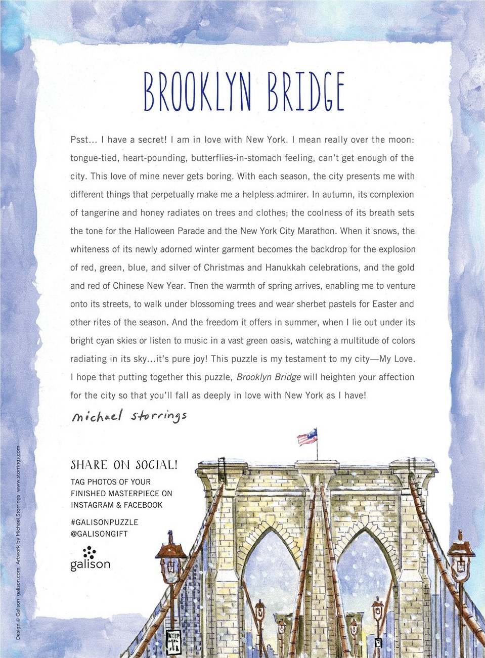 Oceňovaný designér, ilustrátor a kreativní ředitel Michael Storrings zachycuje podstatu slavného newyorského Brooklynského mostu v zimě. Puzzle je baleno v pevných krabicích s matným povrchem. Součástí je také příloha s celým obrázkem puzzle.