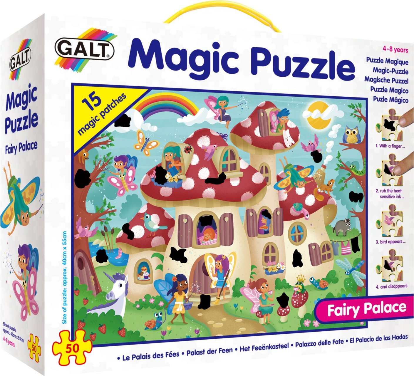 Puzzle s magickými dílky, které reagují na teplotu dětských prstíků! Poskládejte si padesáti dílkové puzzle z nichž 15 má speciální termo vrstvu, která ukrývá části obrázku. Tyto dílky mají standardně černou barvu, stačí však když je párkrát přejedete teplými prsty a objeví se podkladový motiv. Za chvíli dílek opět zčerná, můžete tak odkrývat jednotlivé části obrázku zas a znova. Vhodné pro děti již od 4 let. Dodáváno v kartonu s praktickým plastovým uchem pro snadné přenášení. Rozměr složeného puzzle cca 55 x 40 cm