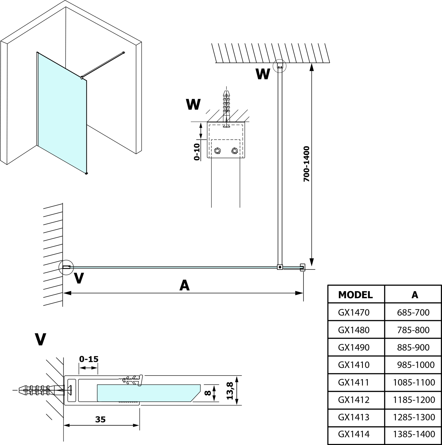 - Stěnové profily s tolerancí 15 mm usnadňují stabilní montáž zástěn, instalace je možná na dlažbu nebo sprchovou vaničku