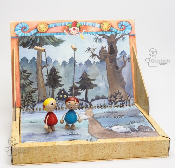 - knižní divadlo obsahuje 4 dřevěné loutky a 4 scény k pohádce O perníkové chaloupce