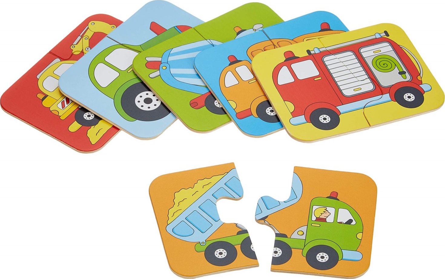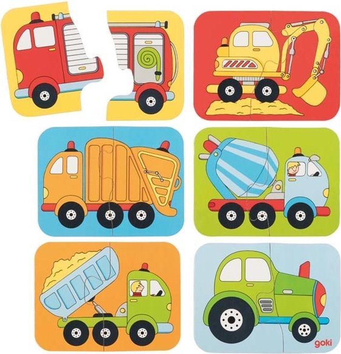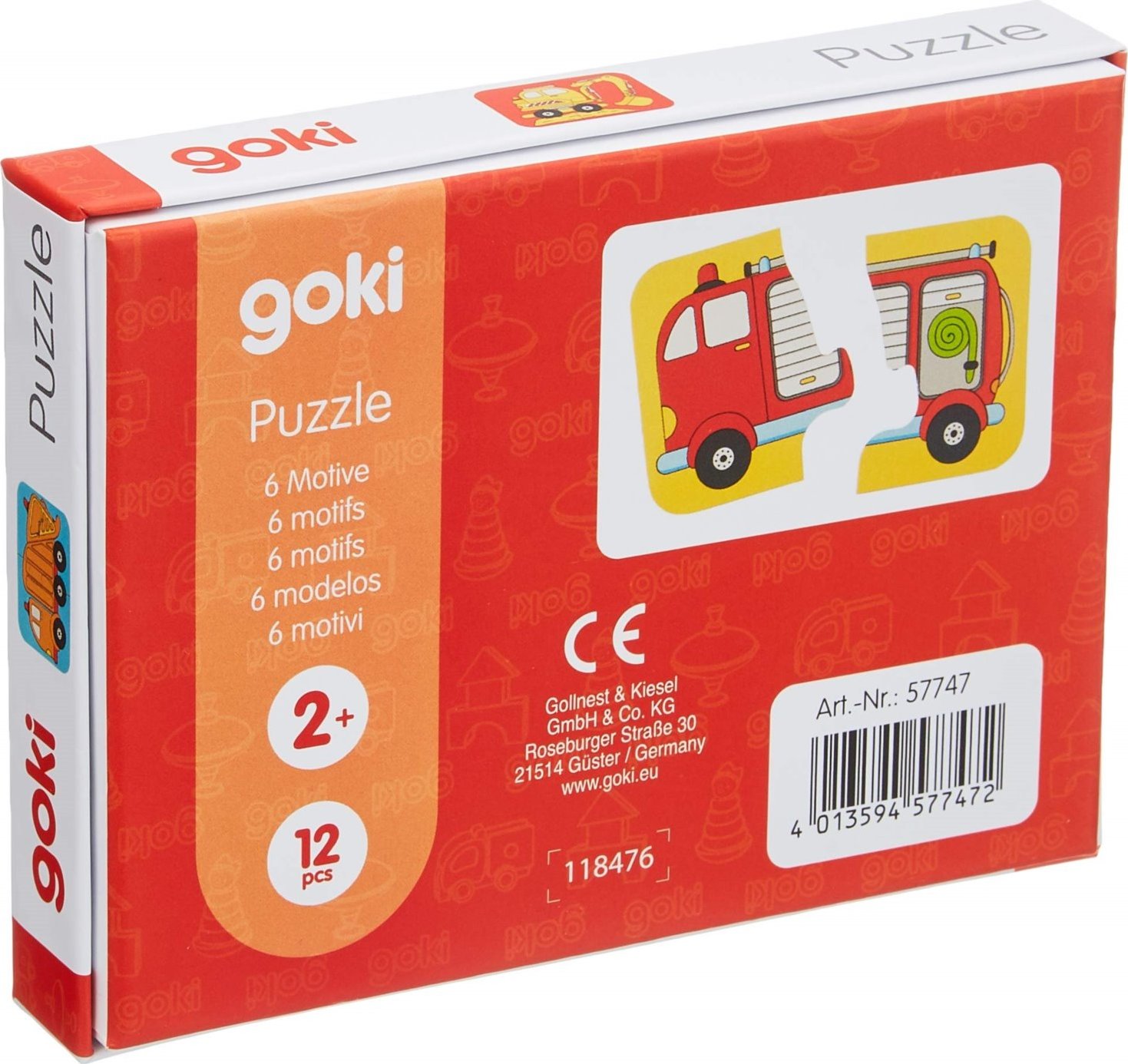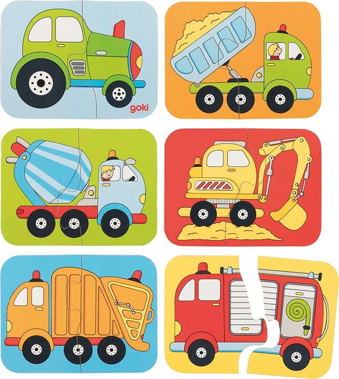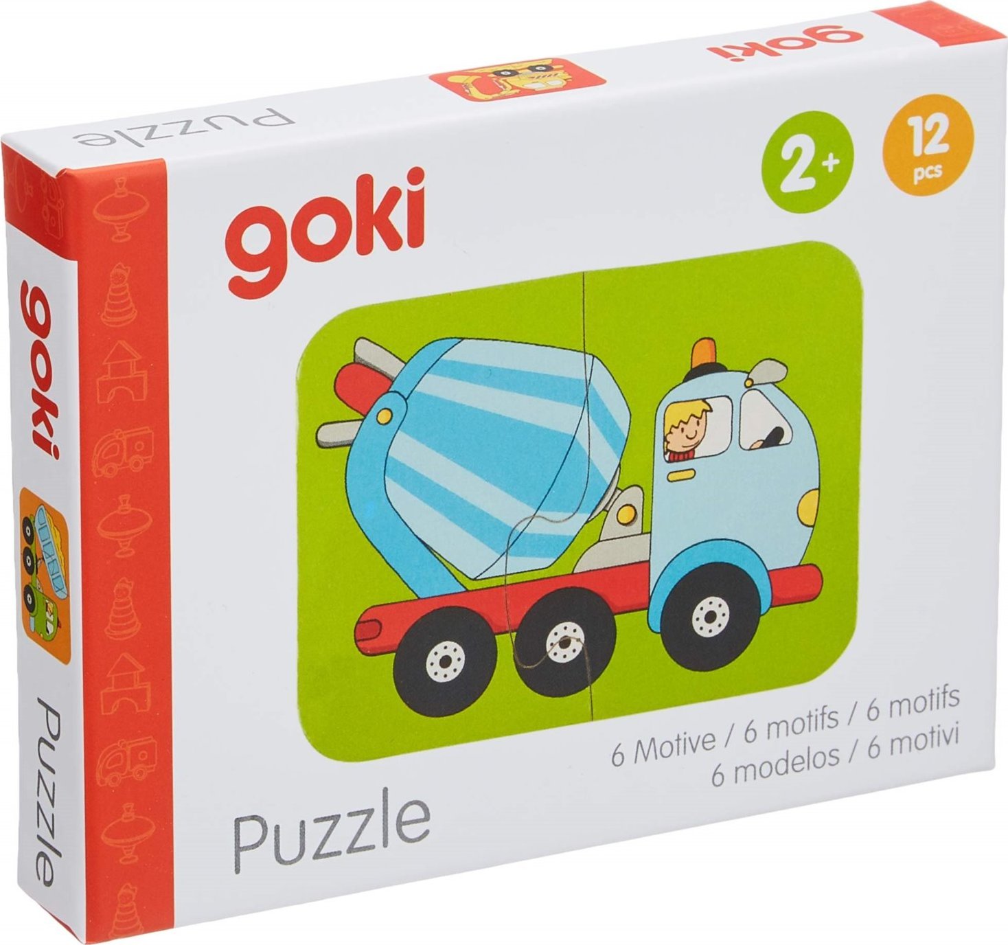Puzzle dvojičky ze dřeva s motivem dopravních prostředků a stavebních strojů. Skládání puzzle rozvíjí fantazii, logické myšlení a podporuje rozvoj motoriky. Doporučeno pro děti od 2 let. GOKI patří mezi nejvýznamnější evropské výrobce hraček s vysokou pedagogickou a didaktickou kvalitou. Firma klade důraz na bezpečnost hraček, jejich zdravotní nezávadnost a dbá na obnovitelné zdroje. Dřevo je bráno tam, kde může dorůstat. Používané dřeviny jsou javor, buk, ořech, lípa, jasan, borovice, bříza a gumovník. Barvy a laky pocházejí od menších výrobců. Rozměr složeného puzzle cca 12 x 9 cmVlastnosti