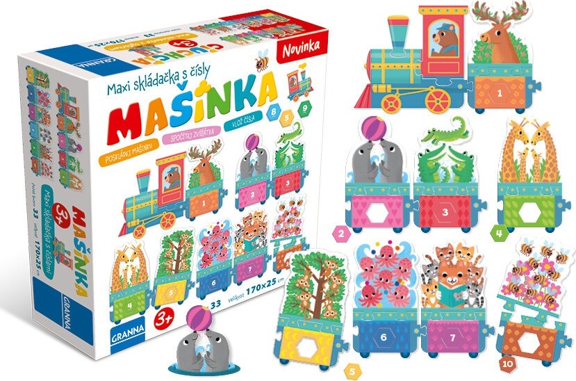 Nastupovat, odjíždíme! Poskládejte mašinku, připojte vagónky, spočítejte zvířátka a přiřaďte k nim správná čísla. Jaká zvířátka se dnes svezou a kolik jich ve vagónech bude? S maxi skládačkou s čísly bude počítání hračka. Díky roztomilým obrázkům zvířátek si děti osvojí základy počítání do 10. Při skládání vláčku také rozvíjejí jemnou motoriku a koordinaci ruka-oko. Naučí se nová slova, rozšíří si slovní zásobu a zlepší komunikační dovednosti.