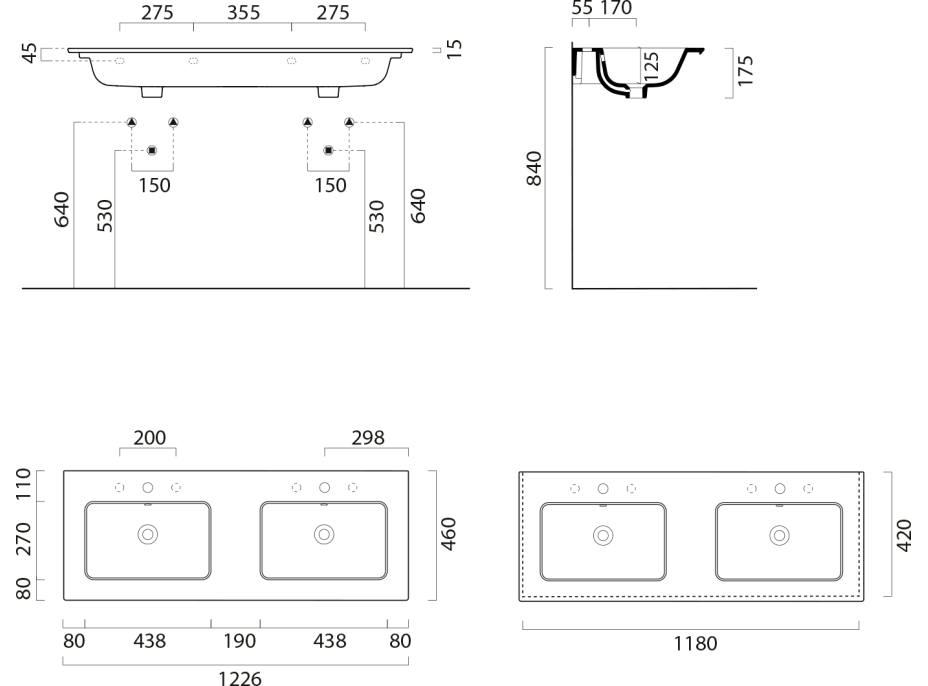 GSI PURA keramické dvojumyvadlo Slim 122x46cm, bez otvoru, bílá mat 8888009