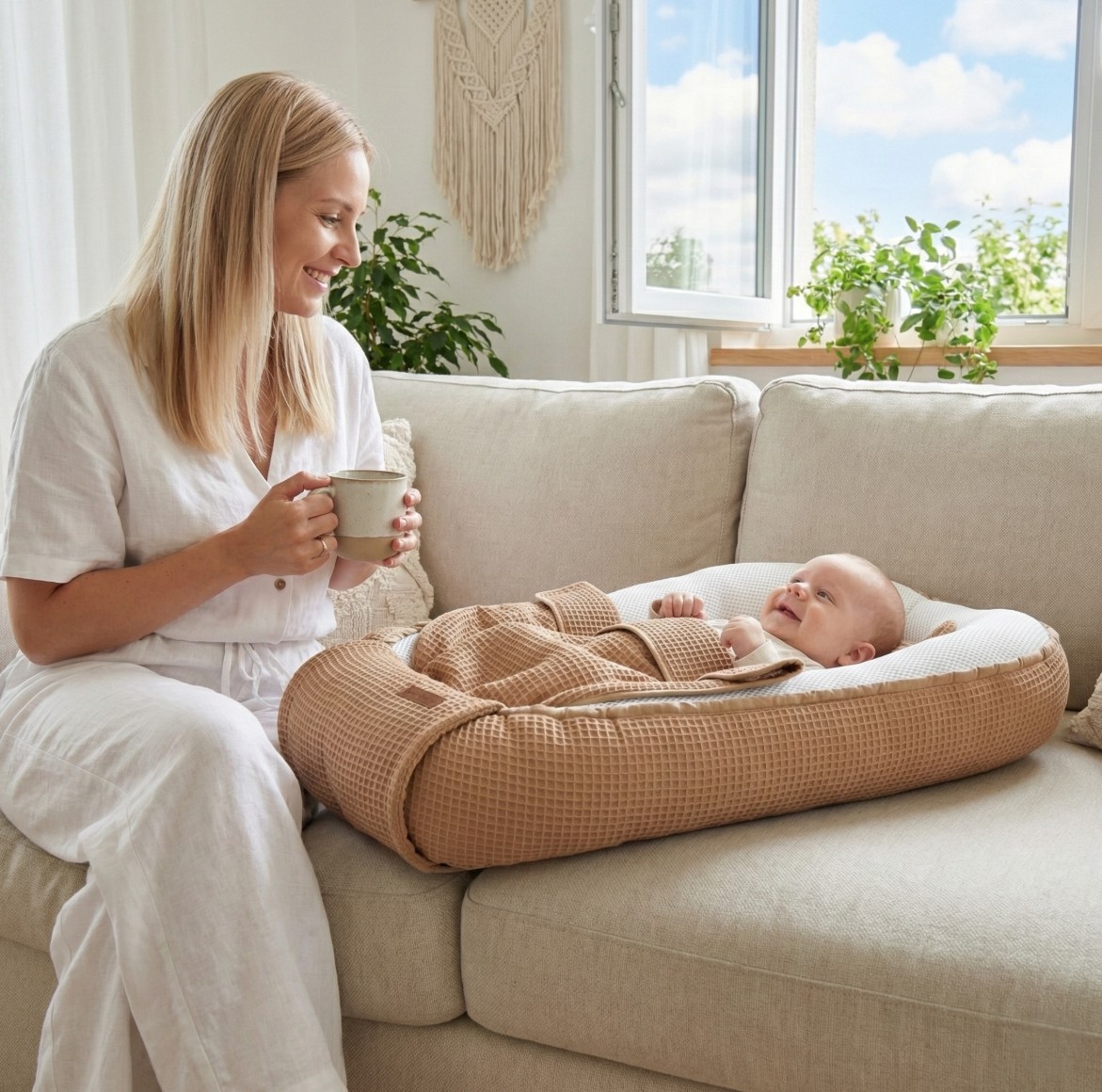 - Bezpečné společné spaní (blízkost s rodiči): Ideální volba pokud chcete být blízko, ale zachovat si oddělený prostor. Kokon vytváří v posteli rodičů bezpečnou zónu. Miminko je blízko, můžete ho cítit, ale má svůj vlastní soukromý prostor.