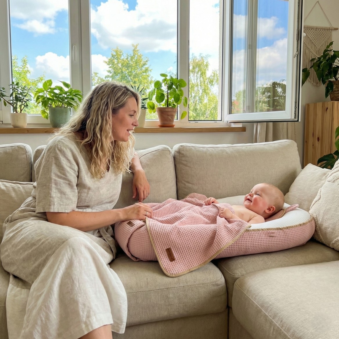 - Bezpečné společné spaní (blízkost s rodiči): Ideální volba pokud chcete být blízko, ale zachovat si oddělený prostor. Kokon vytváří v posteli rodičů bezpečnou zónu. Miminko je blízko, můžete ho cítit, ale má svůj vlastní soukromý prostor.