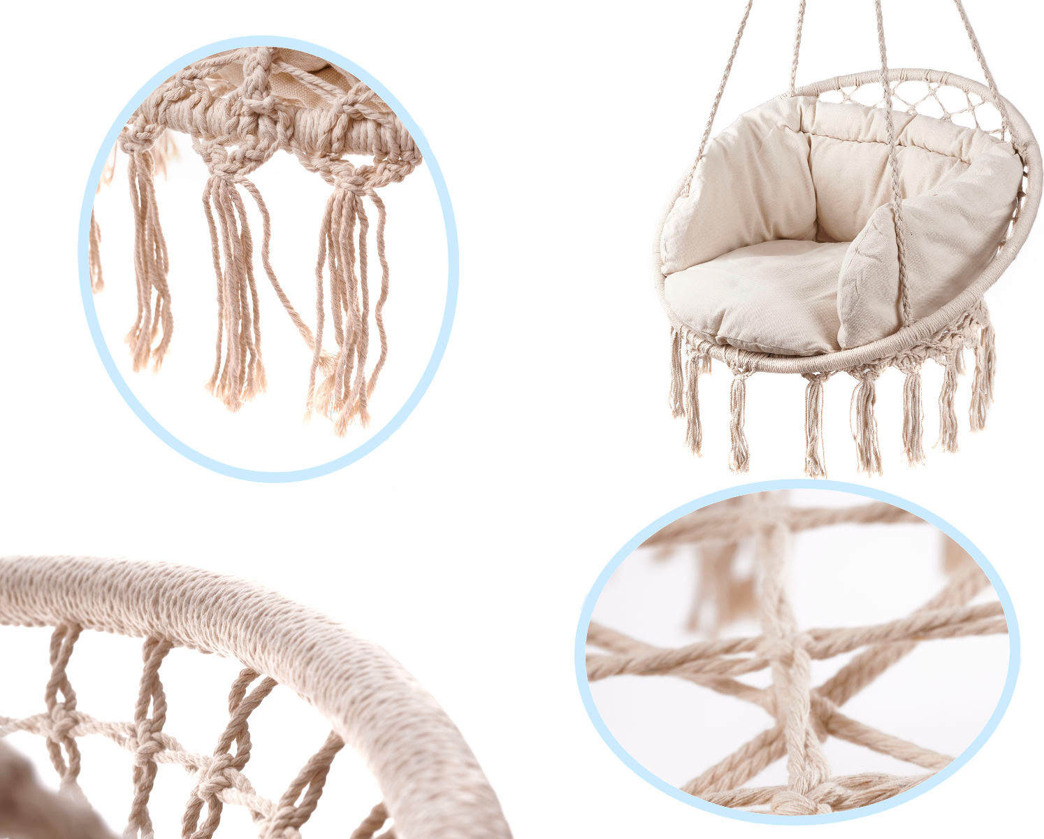 Silná, speciálně tkaná lana a kovový rám zajišťují bezpečnost při relaxaci. Můžete si být jisti, že houpačka vydrží dlouho. Čapí hnízdo je domácí hřiště pro děti a relaxace pro dospělé. Všichni si ji jistě užijí. Velký průměr sedáku zaručuje dostatek prostoru pro relaxaci a hraní. Pohodlné opěradlo a prostorný sedák poskytují výjimečné pohodlí. S touto houpací sítí ve tvaru křesla je relaxace čistým potěšením! Nechte se ovládnout svými sny, uvařte si svůj oblíbený čaj a vezměte si poutavou knihu.