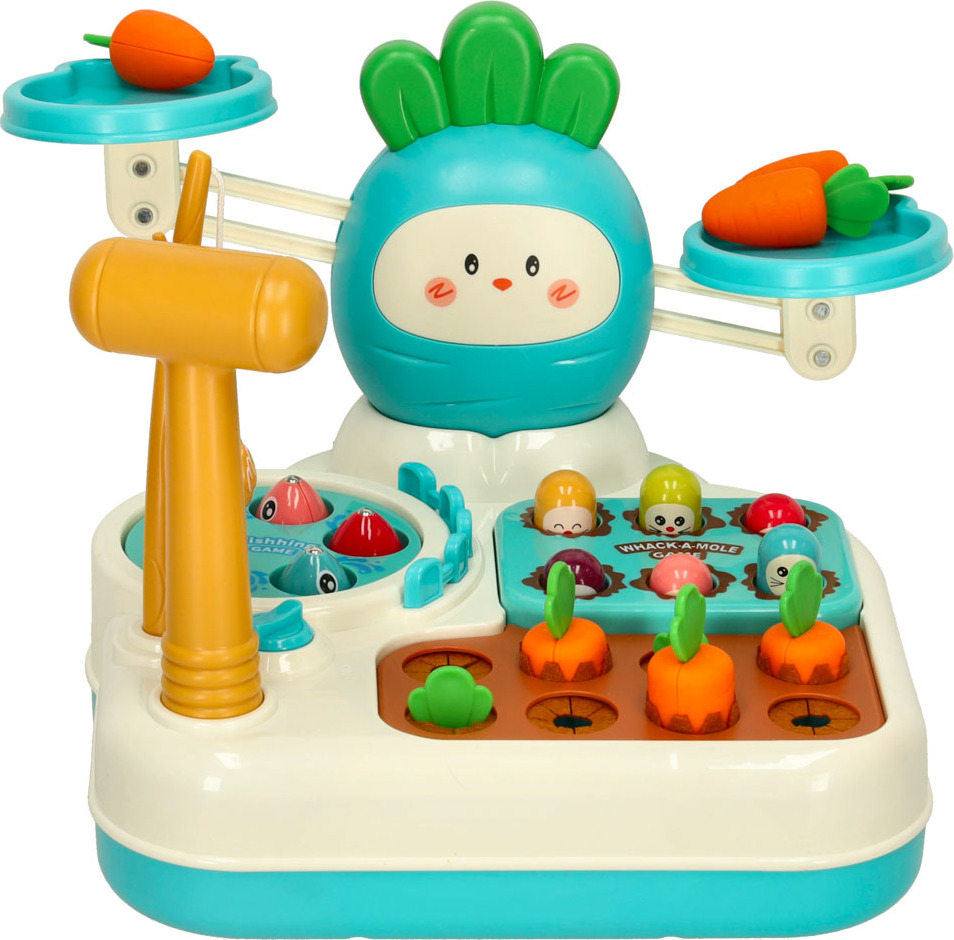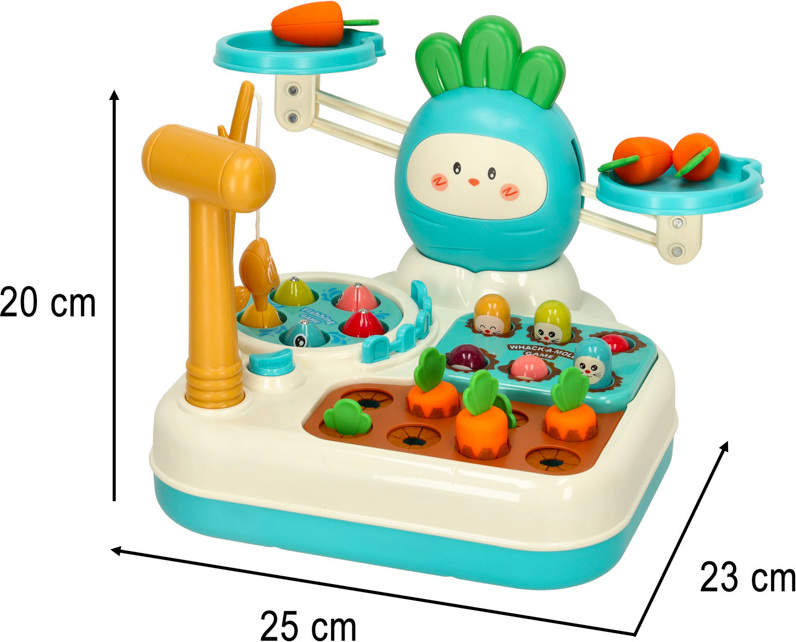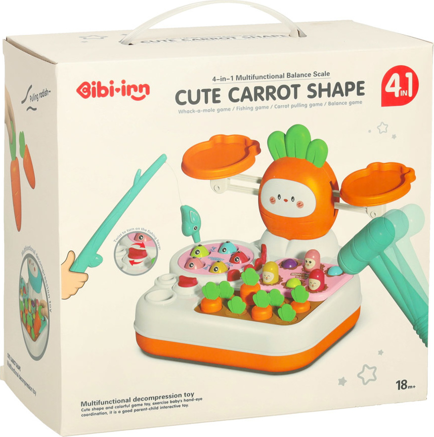 Tato vzdělávací hra ve tvaru mrkve je hračka pro nejmenší, která kombinuje čtyři různé hry, jež rozvíjejí obratnost i logické myšlení. Sada umožňuje chytat barevné ryby, chytat schované krtky, sbírat mrkev a balancovat na váze. Hračka stimuluje rozvoj koordinace oko-ruka a počítacích dovedností. Sada obsahuje základní příslušenství: rybářský prut, kladivo a další barevné prvky, které každou hru obohatí.