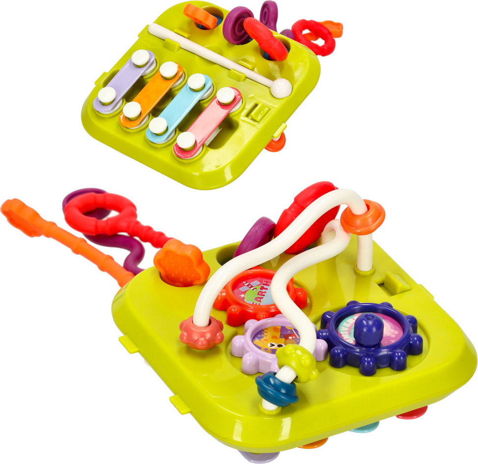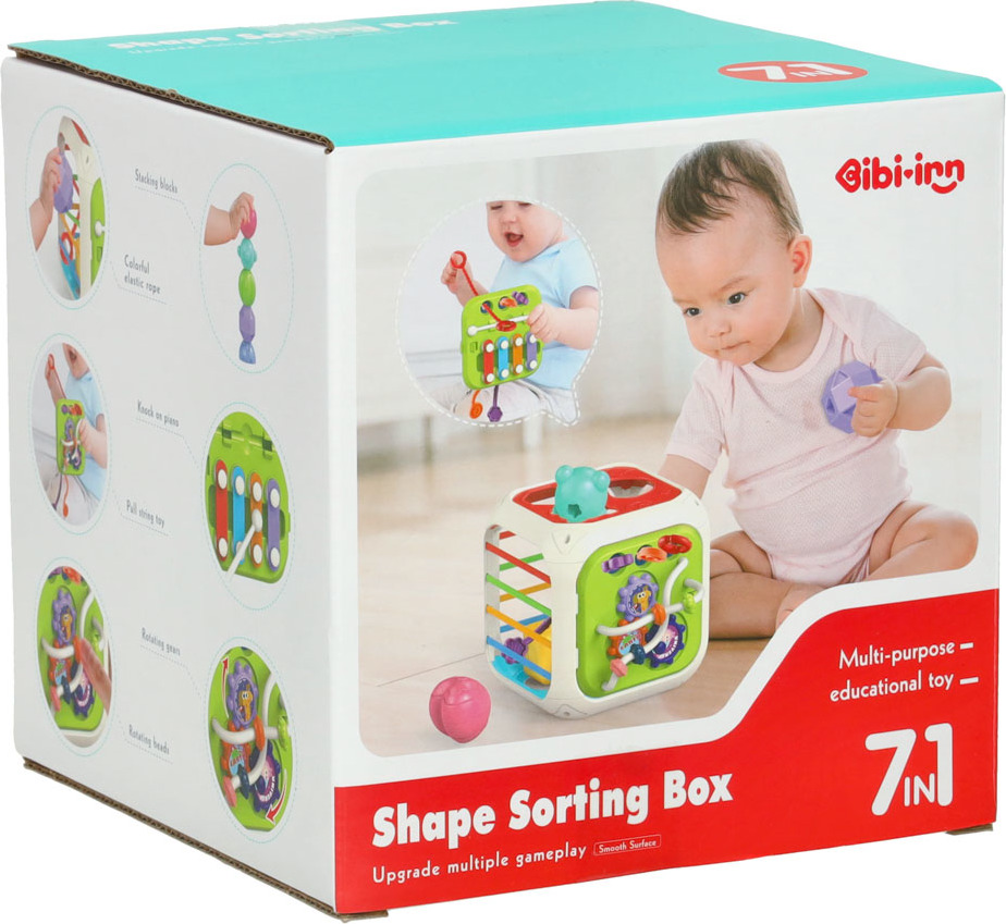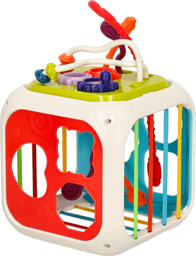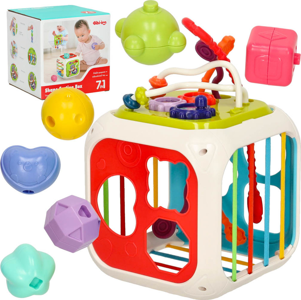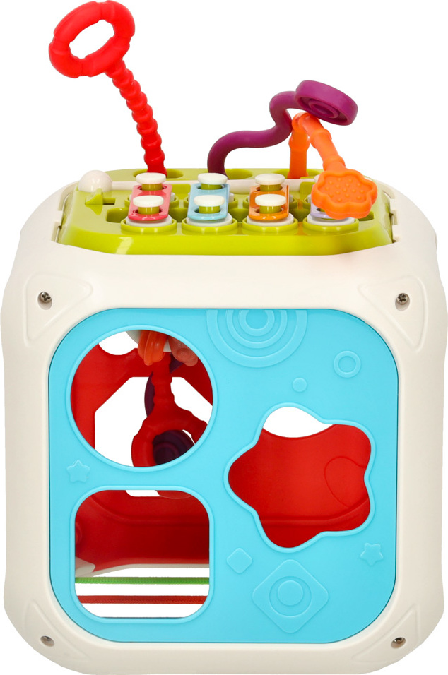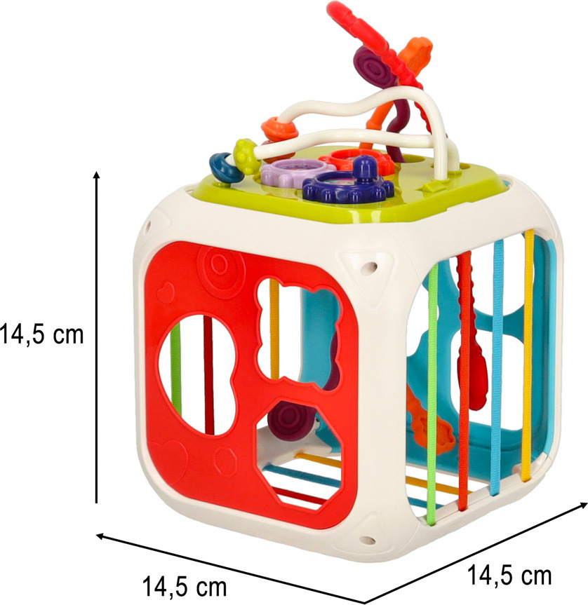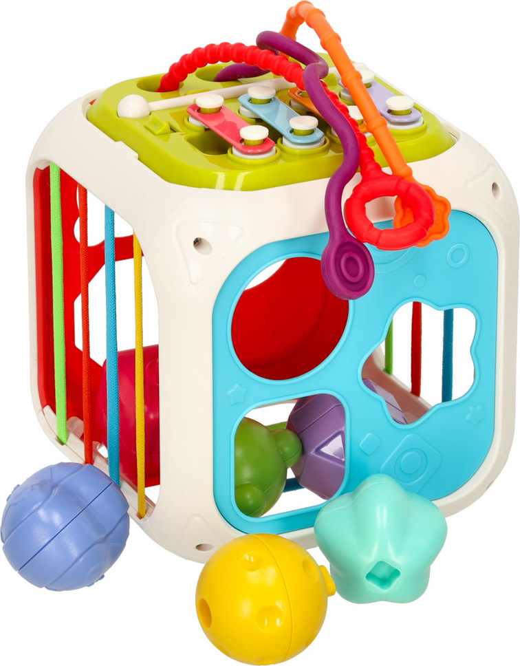 Vzdělávací senzorická kostka je hračka určená pro děti od 18 měsíců a podporuje senzorický, motorický a kognitivní vývoj. Každá strana kostky nabízí různé interaktivní prvky, jako je přiřazování kostek k otvorům, hraní na mini činely, tahání za provázky a posouvání korálků na tyčkách. Sada obsahuje šest barevných kostek, které lze přiřazovat k otvorům nebo skládat na sebe, čímž se rozvíjejí manuální dovednosti dětí.