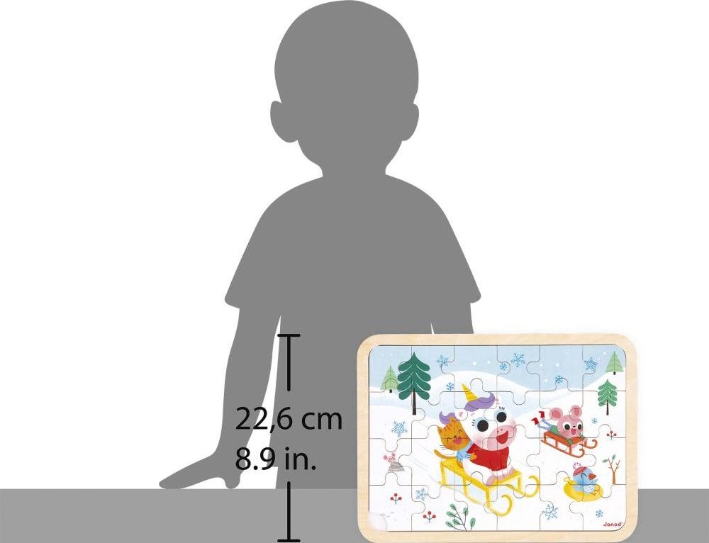 Dětské puzzle ze dřeva s motivem zimních radovánek. Dílky jsou umístěny na dřevěné desce s vyfrézovaným okrajem pro usnadnění skládání. Skládání puzzle rozvíjí fantazii a podporuje rozvoj motoriky. Po poskládání obrázku najdi rozdíly v předloze.