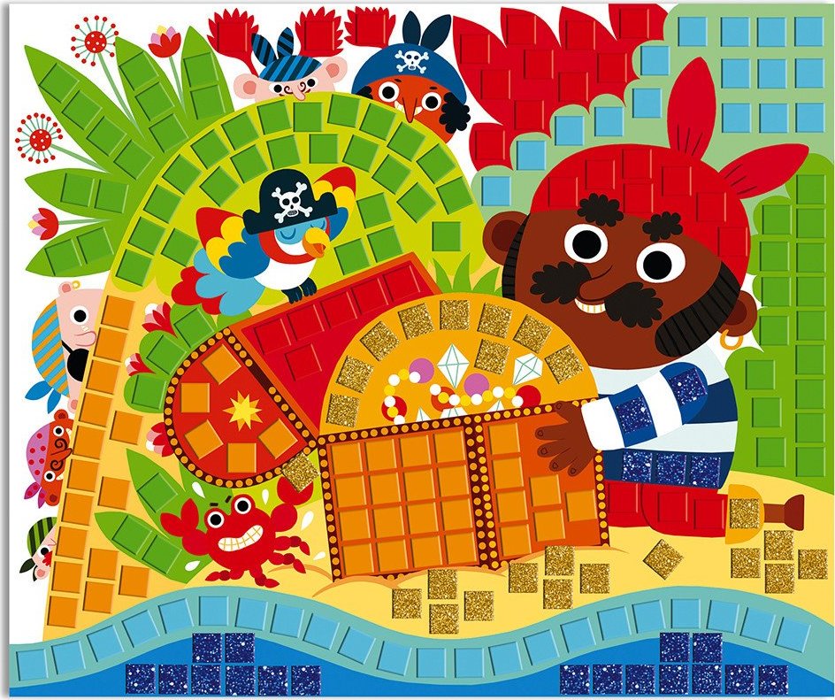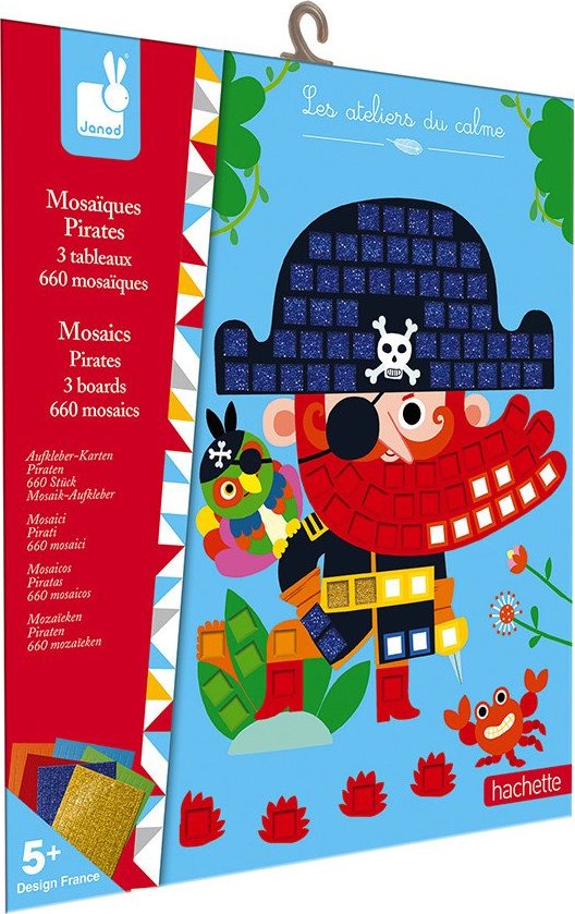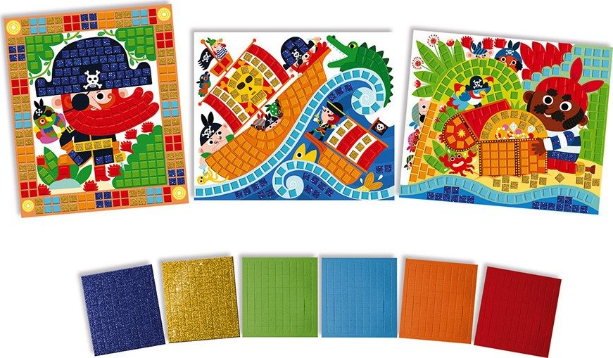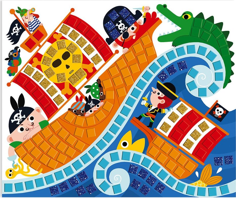 Mozaika pro všechny malé piráty. Krásná mozaika s pestrobarevnými obrázky obsahuje 6 listů s třpytivými a barevnými mozaikovými nálepkami. Mozaika podporuje hmatový rozvoj dítěte. V balení jsou 3 obrázky s piráty (rozměry 25 x 21 cm). Vhodné pro děti od 5 let. Sada Janod Atelier na tvoření a podporu dovednosti a představivosti u dětí. Kreativní hračky pro děti nezabírají mnoho místa, jsou vhodné na cesty i na doma, ve zdraví i nemoci a zabaví děti na dlouhé hodiny. Tvoření různými technikami podporuje soustředění a koncentraci, přirozené zkoumání a výtvarné schopnosti.Vlastnosti