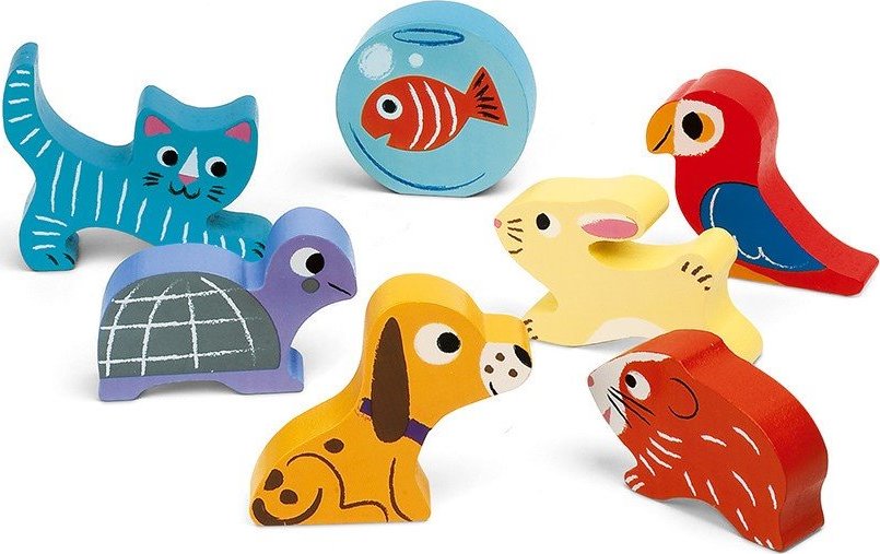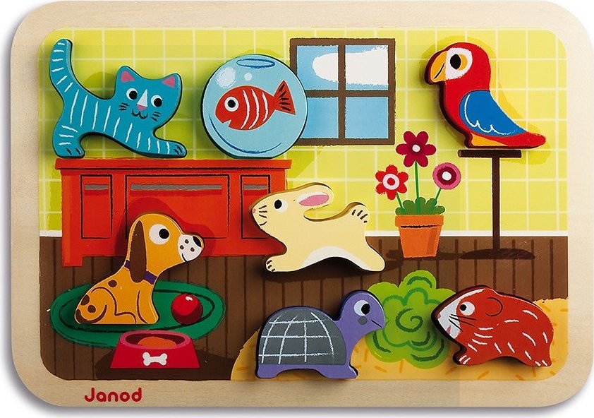 Dětská vkládačka se sedmi vkládacími obrázky domácích mazlíčků. Nádherně ilustrované dřevěné vkládací puzzle je skvělým dárkem pro vaše nejmenší. Jednotlivé dílky lze použít při hře i jako samostatné postavičky , zvířátka. Na pozadí jednotlivých dílků se nacházejí barvy zvířátek. Puzzle rozvíjejí jemnou motoriku vašich dětí, a zároveň jsou skvělým pomocníkem při učení se tvarů, barev a rozpoznávání různých objektů. Doporučeno pro děti od 12 měsíců.Vlastnosti