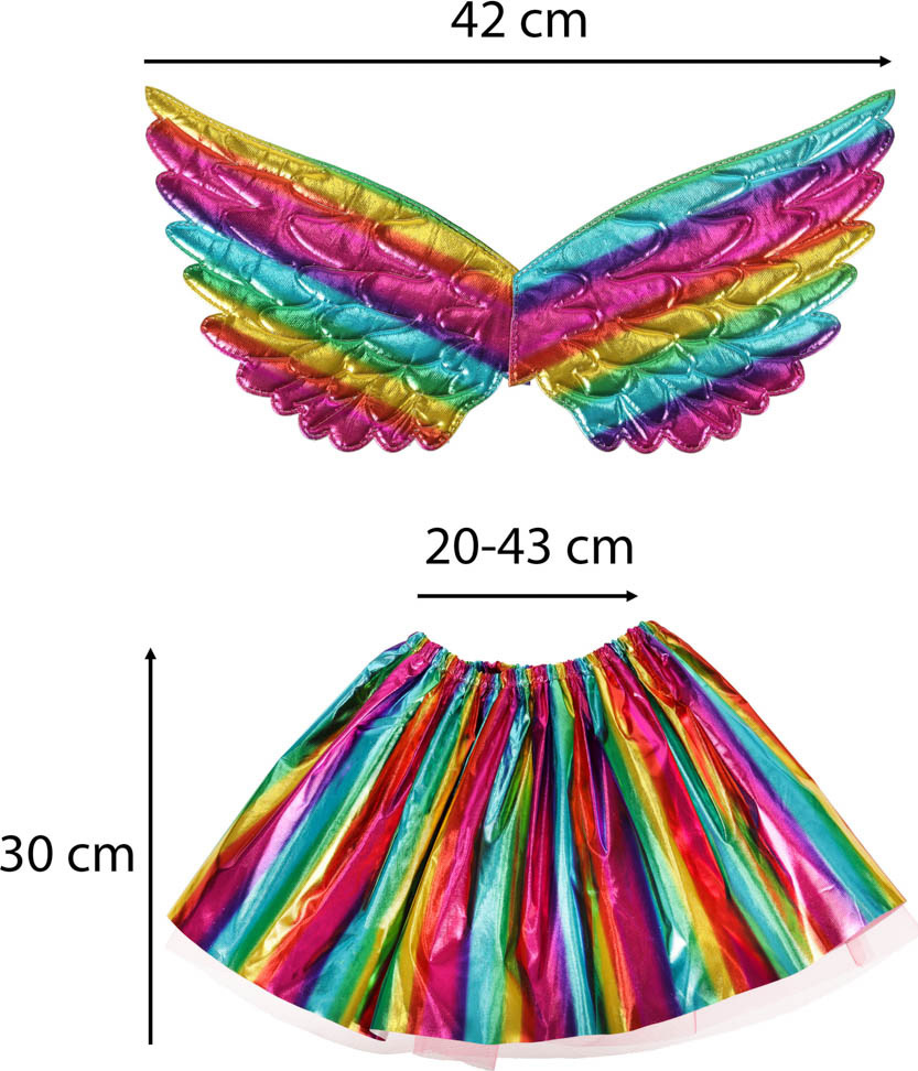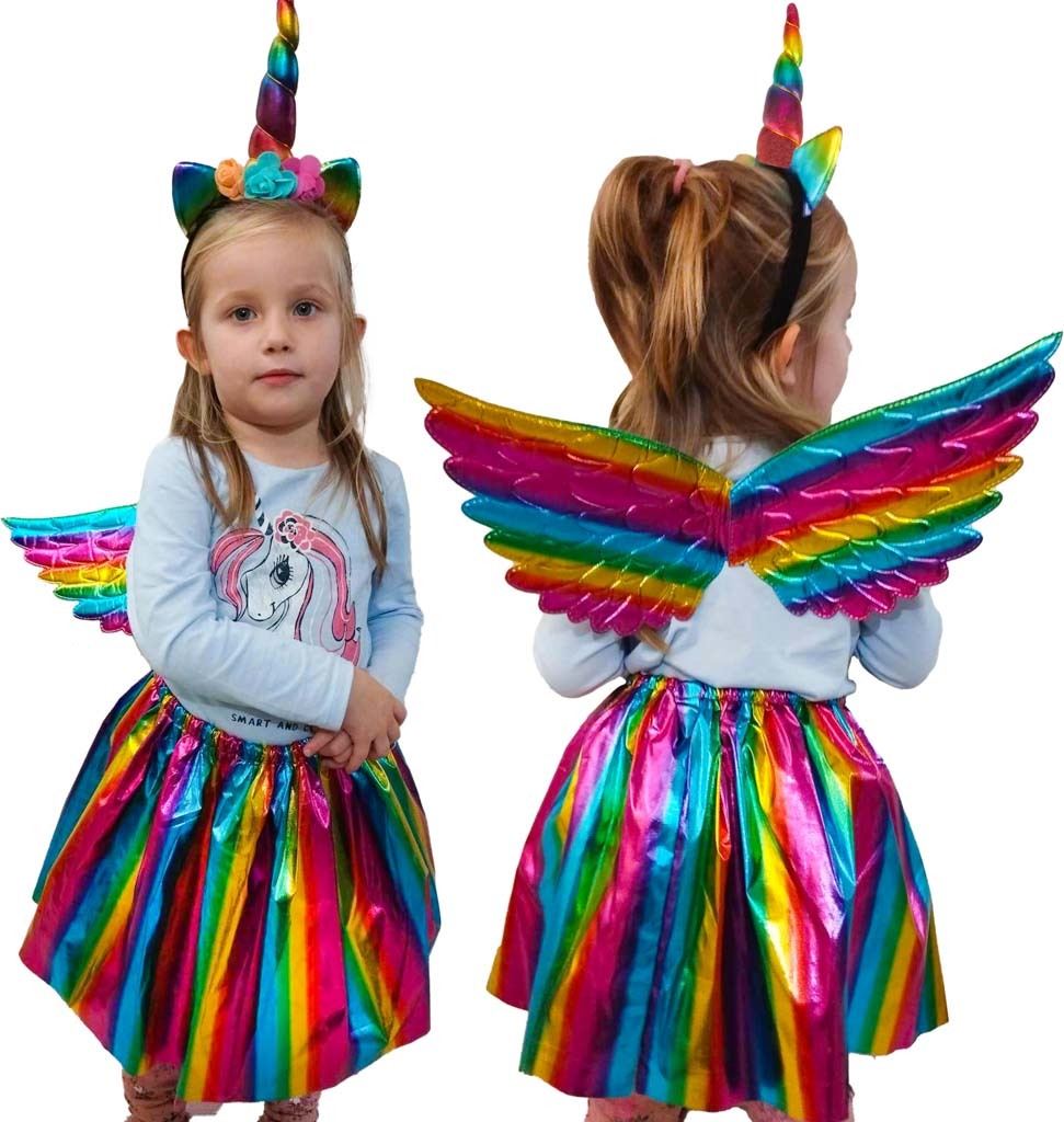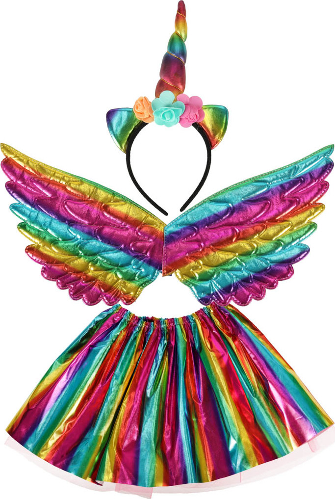 Barevný, pohádkový a plný kouzel – tento kostým jednorožce je jedinečný karnevalový kostým pro děti, který je přenese do světa fantazie. Sada, navržená jako kostým jednorožce s výraznými doplňky, obsahuje duhovou sukni, čelenku jednorožce a křídla jednorožce, což kostýmu dodává ucelený a ležérní vzhled. Tento kostým jednorožce je ideální na plesy a večírky, kde mají karnevalové kostýmy přitahovat pozornost.