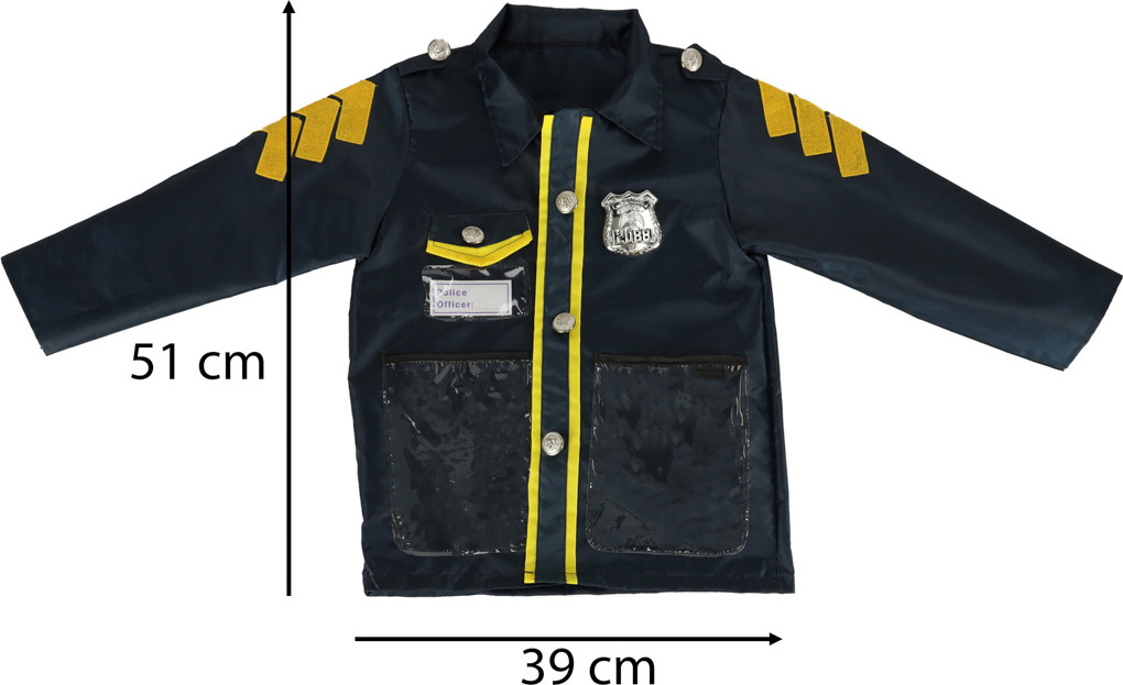 - Detaily: ozdobné knoflíky, žluté lemování, průhledné kapsy, podpisová visačka, policejní odznak