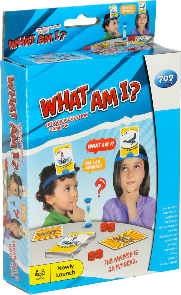 „Kdo jsem?“ je společenská hra, ve které je třeba hádat kartu na čelence. Hráči svou kartu nevidí a musí uhodnout její obrázek kladením otázek. Sada obsahuje žetony a přesýpací hodiny pro měření času kola. Hra rozvíjí kreativitu, logické myšlení a učí, jak se vyrovnat s časovým tlakem.