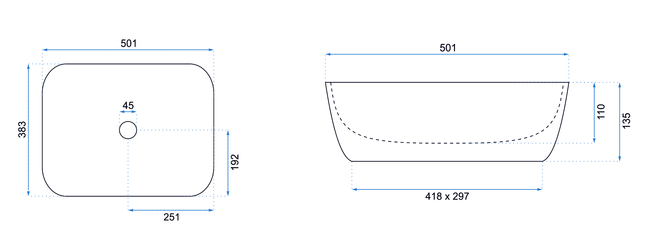 - Rozměry umyvadla: 501 x 383 x 135 mm