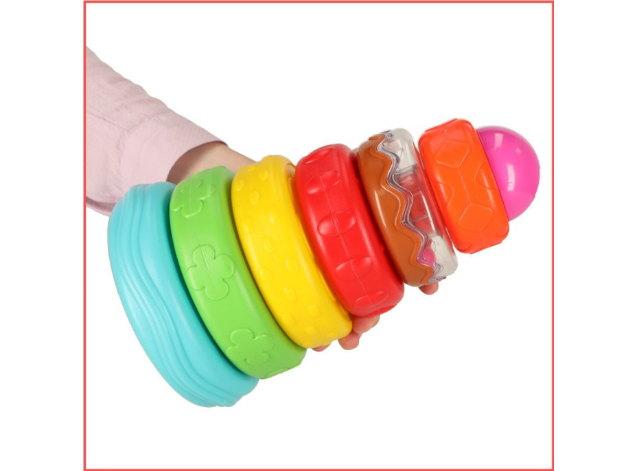Barevná vzdělávací věž s kruhy v různých barvách a texturách.