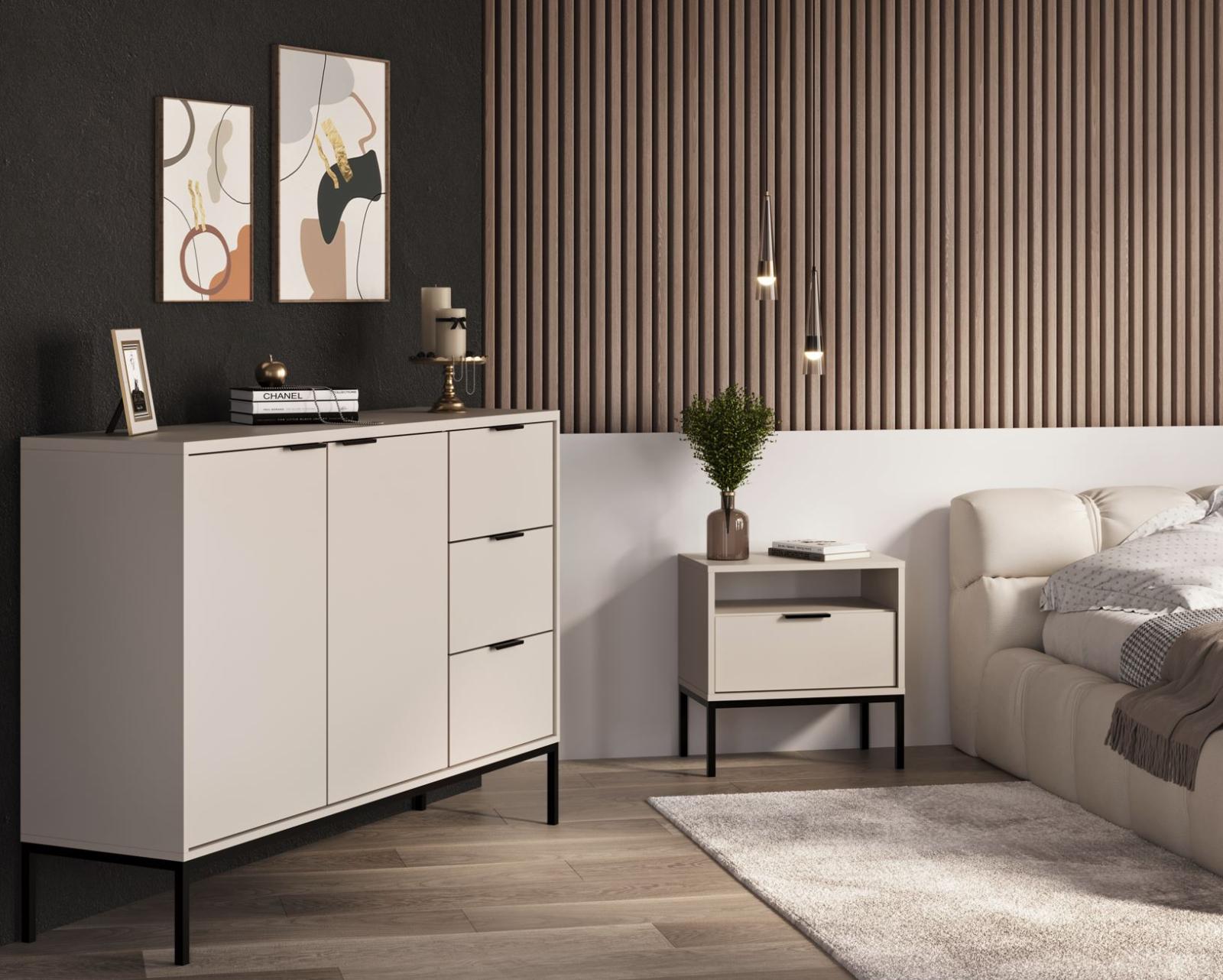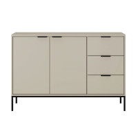 Komoda Austin vyniká především svými barvami, které jemně tónují okolí a dokonale ladí s ostatními dekorativními prvky v místnosti. Pevný korpus vyrobený z laminované dřevotřísky o tloušťce 18 mm zaručuje životnost a odolnost proti poškození. Eleganci komody podtrhují černé hliníkové úchytky a ocelový rám s práškovým nástřikem, který zajišťuje nejen stabilitu konstrukce, ale dodává jí i vytříbený charakter. Barva rámu dokonale ladí s celkem a vytváří tak luxusní a ucelený vzhled.