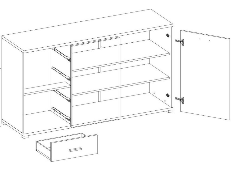 Komoda FREYA s velkou skříňkou a čtyřmi šuplíky je skvělým řešením pro úložný prostor v ložnici nebo obývacím pokoji. Tato komoda nabízí dostatek místa pro oblečení, knihy, hračky nebo jiné předměty. Komoda má elegantní design s úchytkami z PVC, které jsou odolné a snadno se čistí.