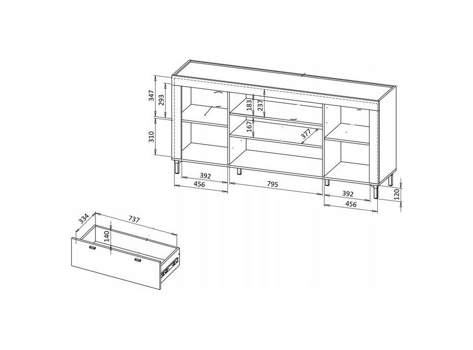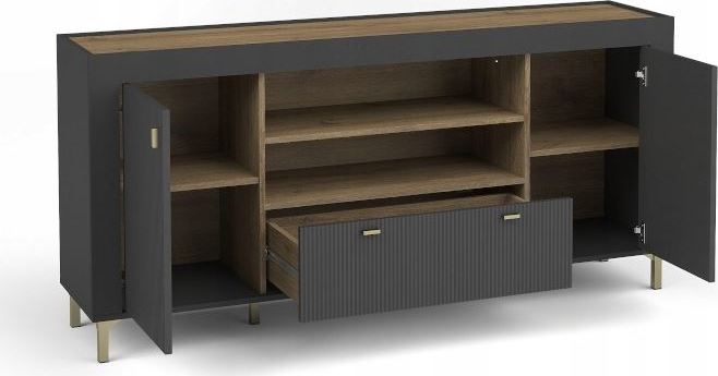 Komoda je vyrobená z kvalitních laminátových dřevotřískových desek s 3D drážkovaným efektem, který jí dodává originální strukturu. Okraje jsou chráněny ABS a PVC hranami, čímž se zvyšuje odolnost nábytku. Komoda je rozdělena na tři části, v levé a pravé části se nachází uzavřená skříňka s policí, uprostřed je praktický šuplík a otevřená police. Doporučujeme nábytek zkombinovat s dalšími produkty kolekce MOSSA a vytvořit tak jedinečné a příjemné prostředí.