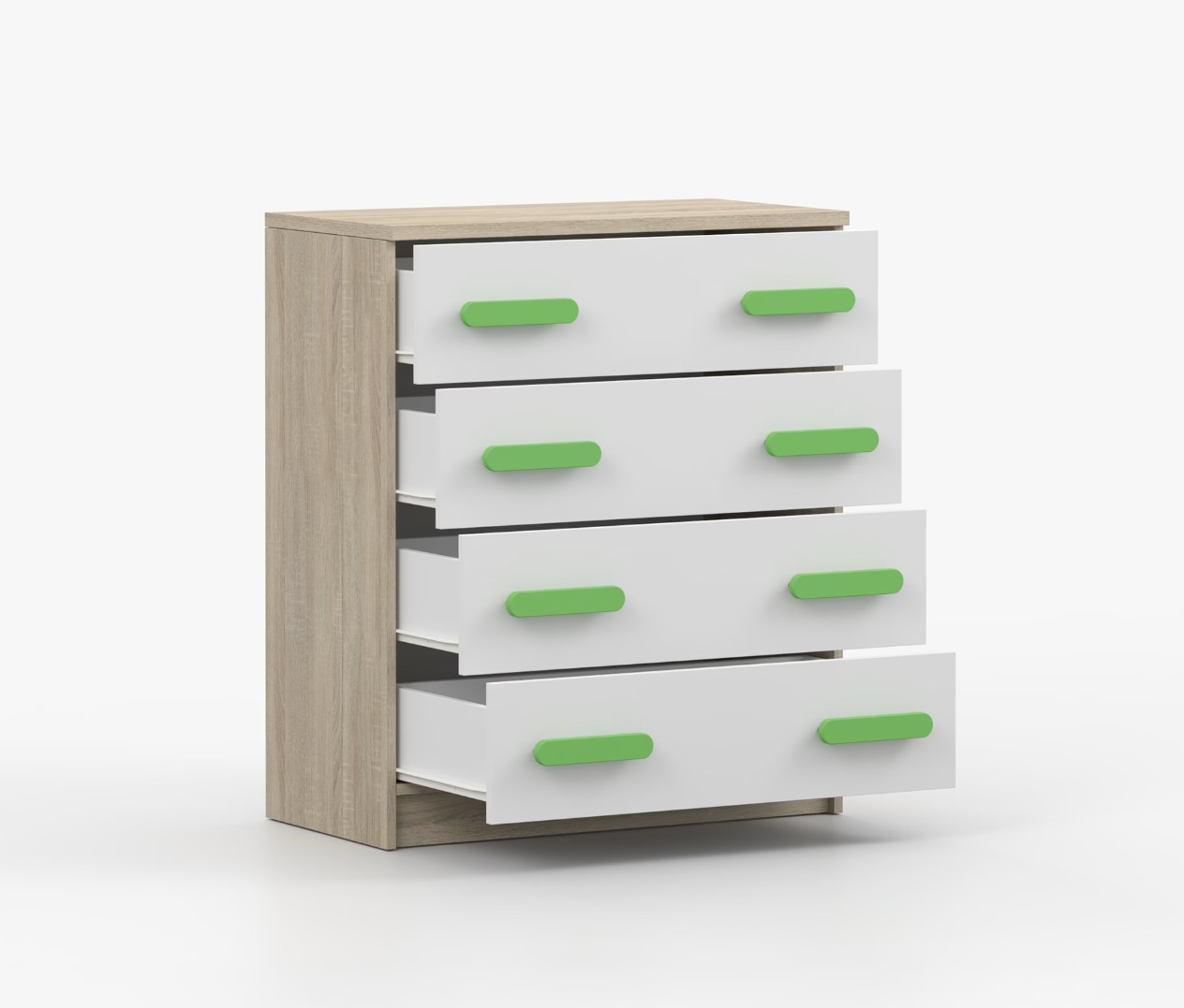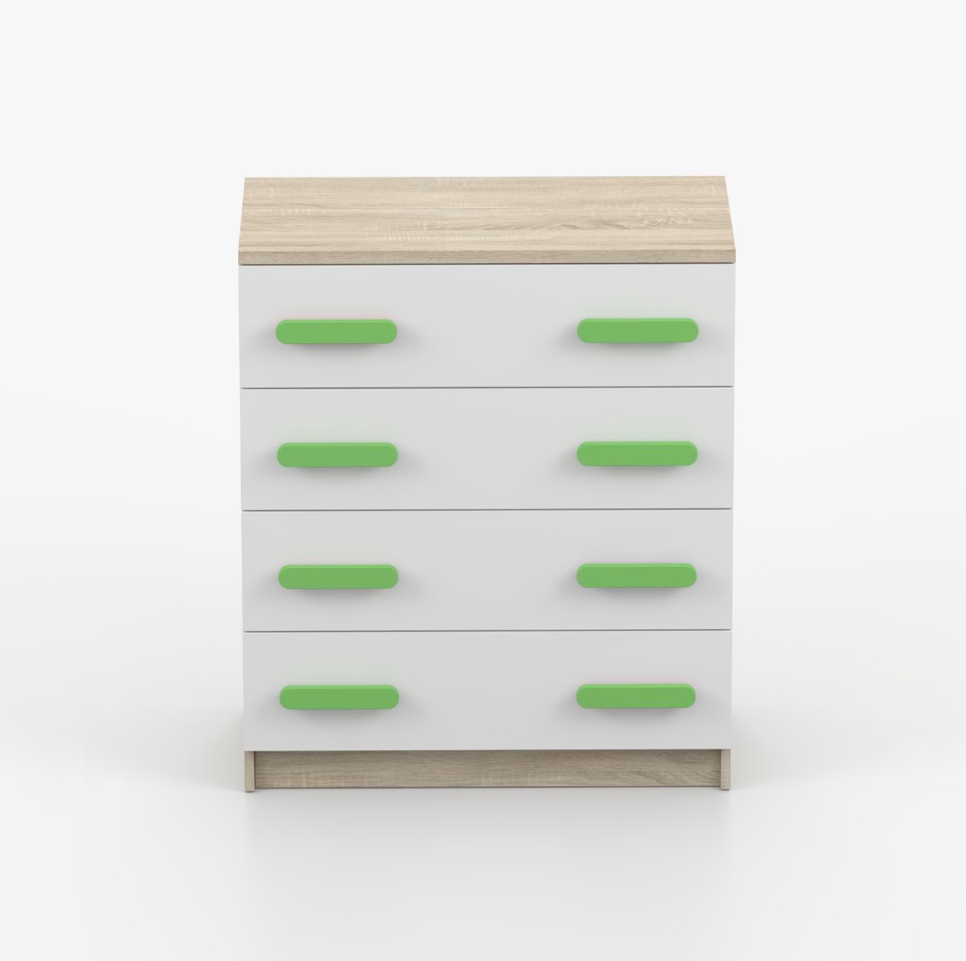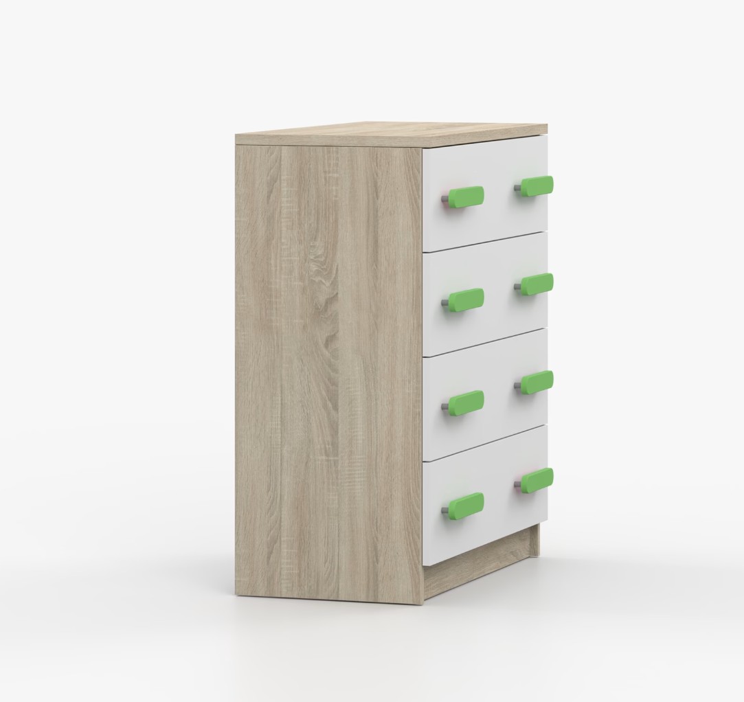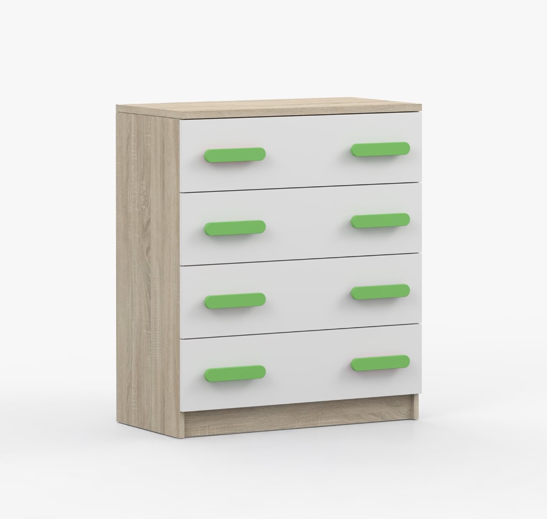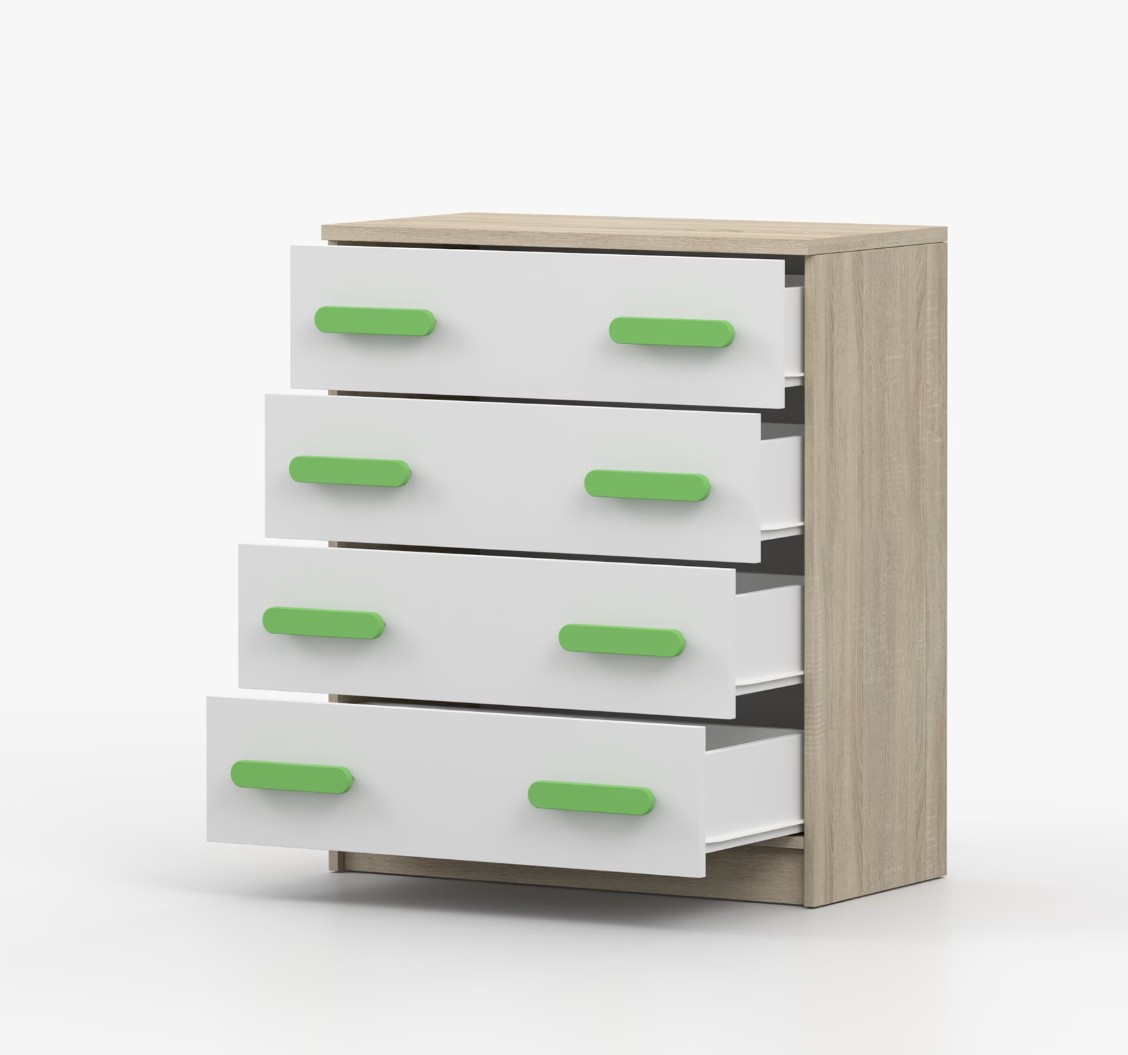 Komoda SCOUT je praktický kus nábytku s moderním designem, který se snadno začlení do jakéhokoliv interiéru. Čtyři prostorné zásuvky s barevnými úchytkami poskytují dostatek úložného prostoru. Komoda je vyrobena z kvalitní laminované desky o tloušťce 16 mm, která je odolná proti poškrábání, poškození, vlhkosti a vysokým teplotám. Hrany jsou zakončeny ABS lištou, což zajišťuje jejich odolnost a pevnost.